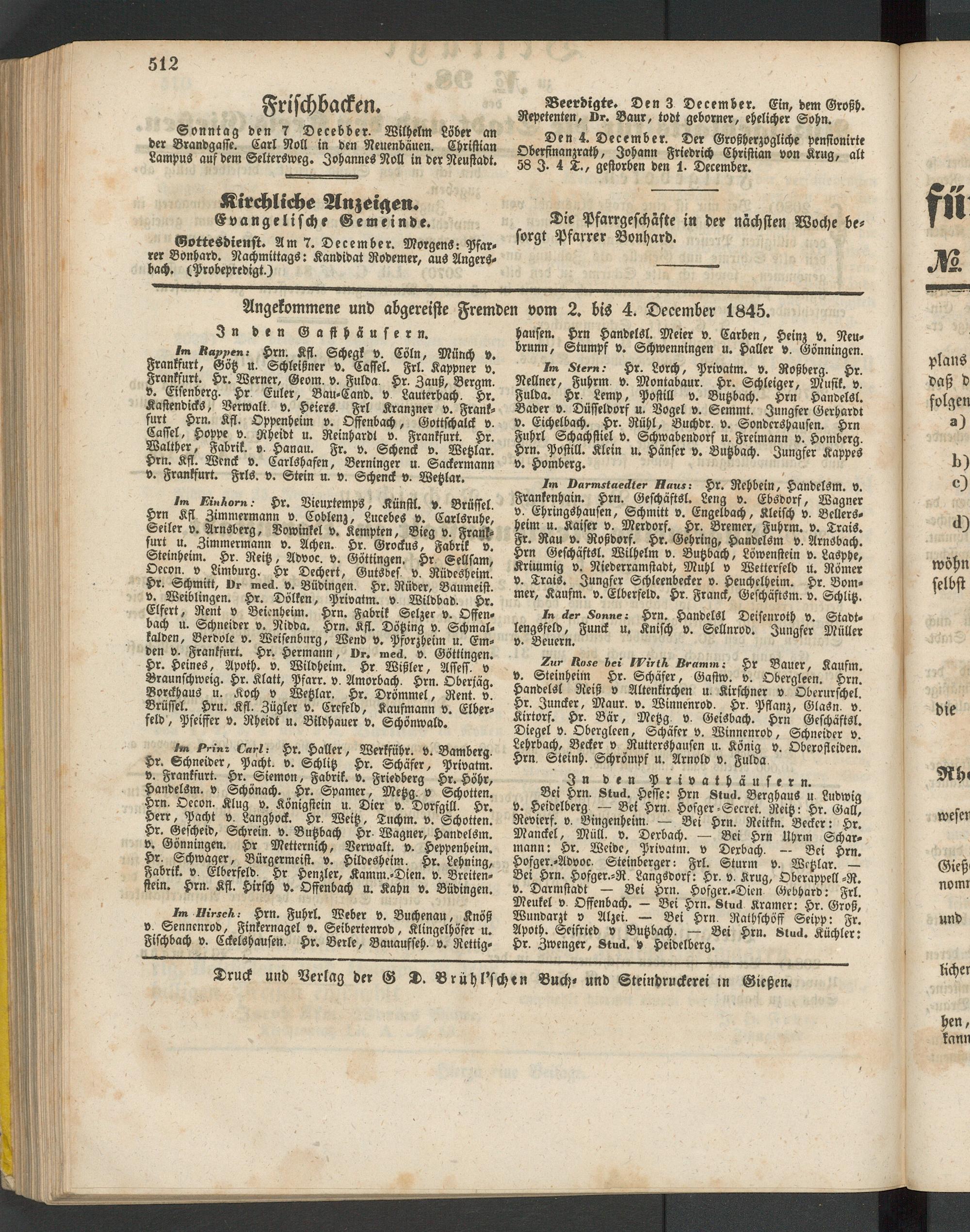 im Prim Carl: Hr. Haller, Werkführ. v. Bamberg. Hr. Schneider, Pacht, v. Schlitz Hr. Schäfer, Privatm. v. Frankfurt. Hr. Siemon, Fabrik, v. Friedberg Hr. Höhr, Handelsm. v Schönach. Hr. Spamer, Meßg. v Schotten. Hrn. Oecon. Klug v. Königstein u. Dier v. Dorfqill. Hr. Herr, Pacht v. Langhock. Hr. Weitz, Tnchm. v. Schotten. Hr. Gescheid, Schrein, v. Butzbach Hr. Wagner, Handelsm. v. Gönningen. Hr Metternich, Verwalt, v. Heppenheim. Hr. Schwager, Bürgermeist. v. Hildesheim. Hr. Lehning, Fabrik, v. Elberfeld. Hr Henzler, Kamm.-Dien. v. Breitenstein. Hrn. Kfl. Hirsch v. Offenbach u. Kahn v. Büdingen.
