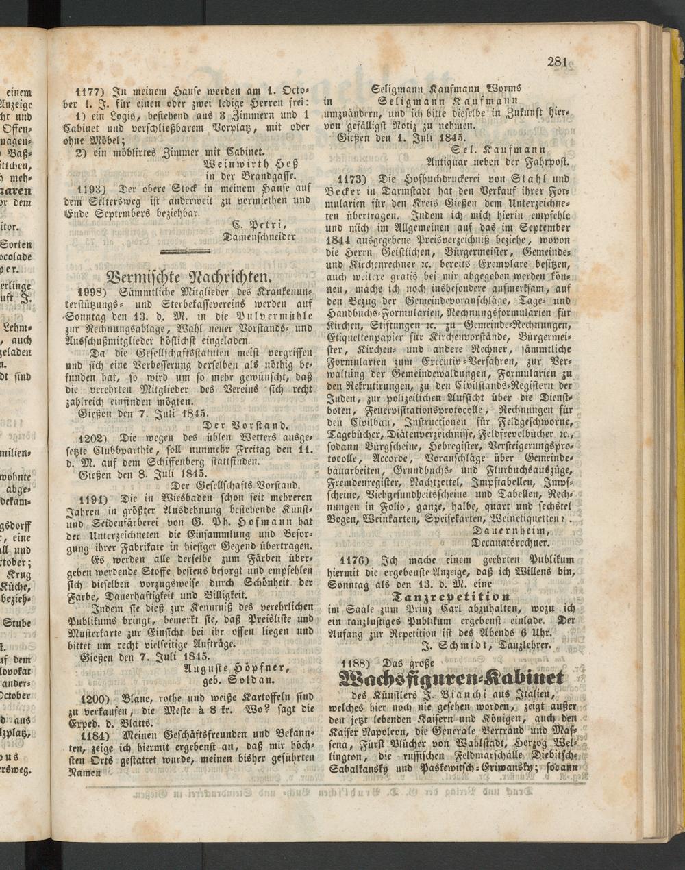 1173) Tie Hofbuchdruckerei von Stahl und Becker in Darmstadt hat den Verkauf ihrer For- mularicn für den Kreis Gießen dem Unterzeichneten übertragen. Indem ich mich hierin empfehle und mich im Allgemeinen auf das im September 1844 ausgegebeue Prcisverzeichmß beziehe, wovon die Herrn Geistlichen, Bürgermeister, Gcmeiude- und Kirchenrechner rc. bereits Exemplare besitzen, auch weitere gratis bei mir abgegeben werden können, mache ich noch insbesondere aufmerksam, auf den Bezug der Gemeiudevoranschläge, Tage- und Handbuchs-Formularieu, Rechnuugsformularien für Kirchen, Stiftungen rc. zu Gemeinde-Rechnungen, Etiquettenpapier für Kircheuvorstäude, Bürgermeister, Kirchen- und andere Rechner, jämmtliche Formularien zum Erccutiv-Verfahren, zur Verwaltung der Gemeindewaldungen, Formularien zu den Rekrutirungen, zu den Civilstands-Registern der Juden, zur polizeilichen Aufsicht über die Dienstboten, Feuervisirationsprotocolle, Rechnungen für den Civilbau, Instructionen für Feldgeschwornc, Tagebücher, Diätenverzeichnisse, Feldfrevelbücher rc., sodann Lürgscheine, Hebregistcr, Vcrsteigernngspro- tocolle, Accorde, Voranschläge über Gemeindebauarbeiten, Grundbuchs- und Flurbuchsauszüge, Fremdenregister, Nachtzettel, Jmpstabellen, Impfscheine, Viebzesundheiksscheine und Tabellen, Rechnungen in Folio, ganze, halbe, quart und sechstel Vogen, Weinkarten, Speisekarten, Weinctiquctlen r .