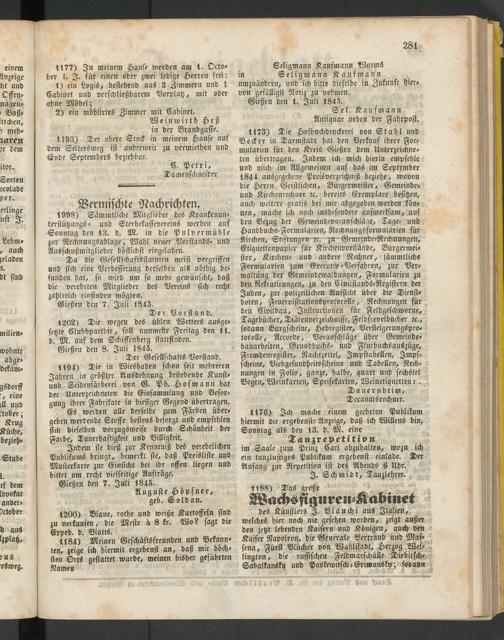 1193) Der obere Stock in meinem Hause auf dem Seltersweg ist anderweit zu vermicthen und Ende Septembers beziehbar.