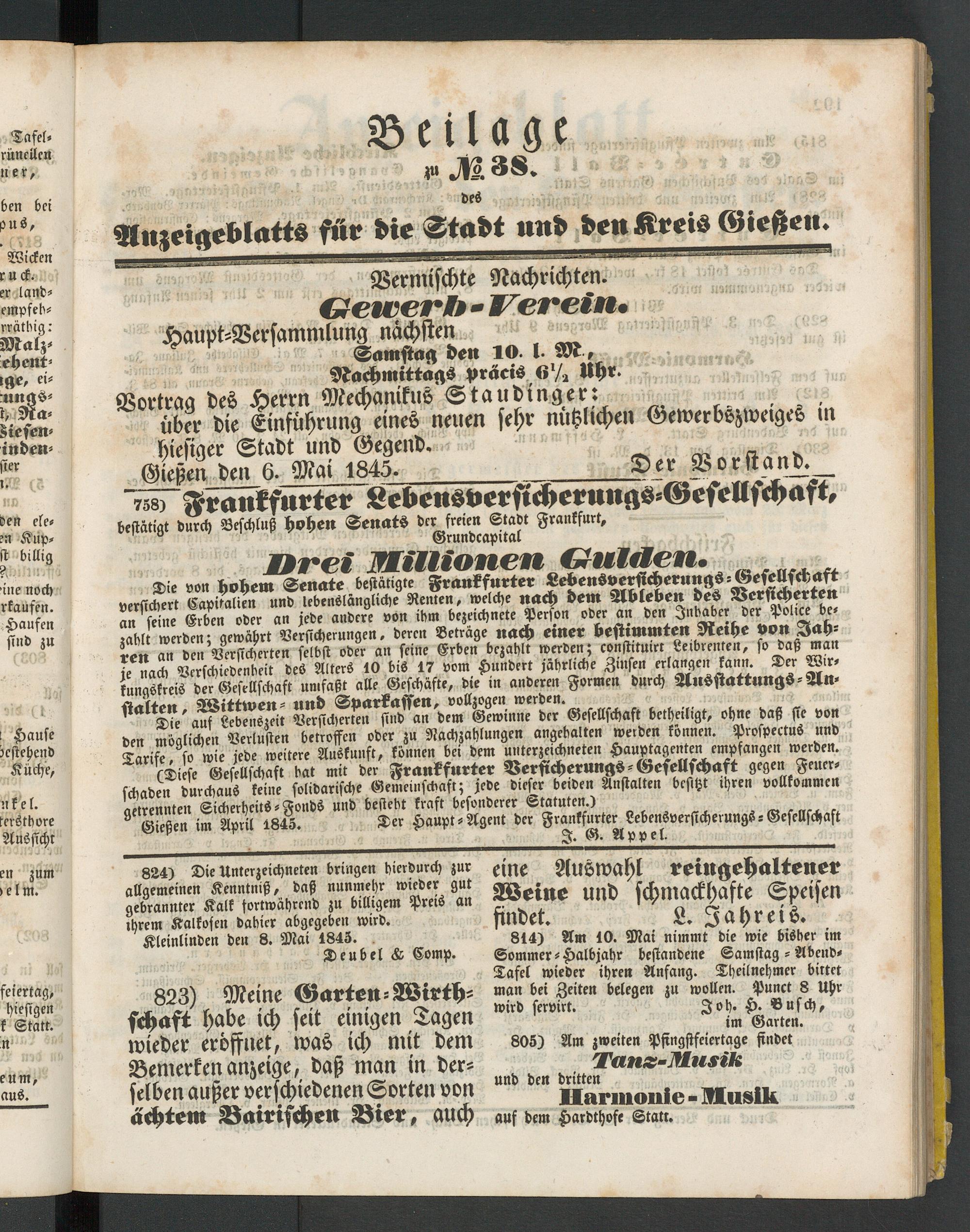 CDiese Gesellschaft bat mit der Frankfurter Berstcherungs-Gefellfchaft gegen Feuerschaden durchaus keine solidarische Gemeinschaft; jede dieser beiden Anstalten besitzt ihren vollkommen ^Gießen"im^Aprst'^Ä?'^ ^Der Haupts-Agent der'Frankfurter Lebensversicherungs-Gesellschaft Glepen rm ^rpru u A M. Appel.