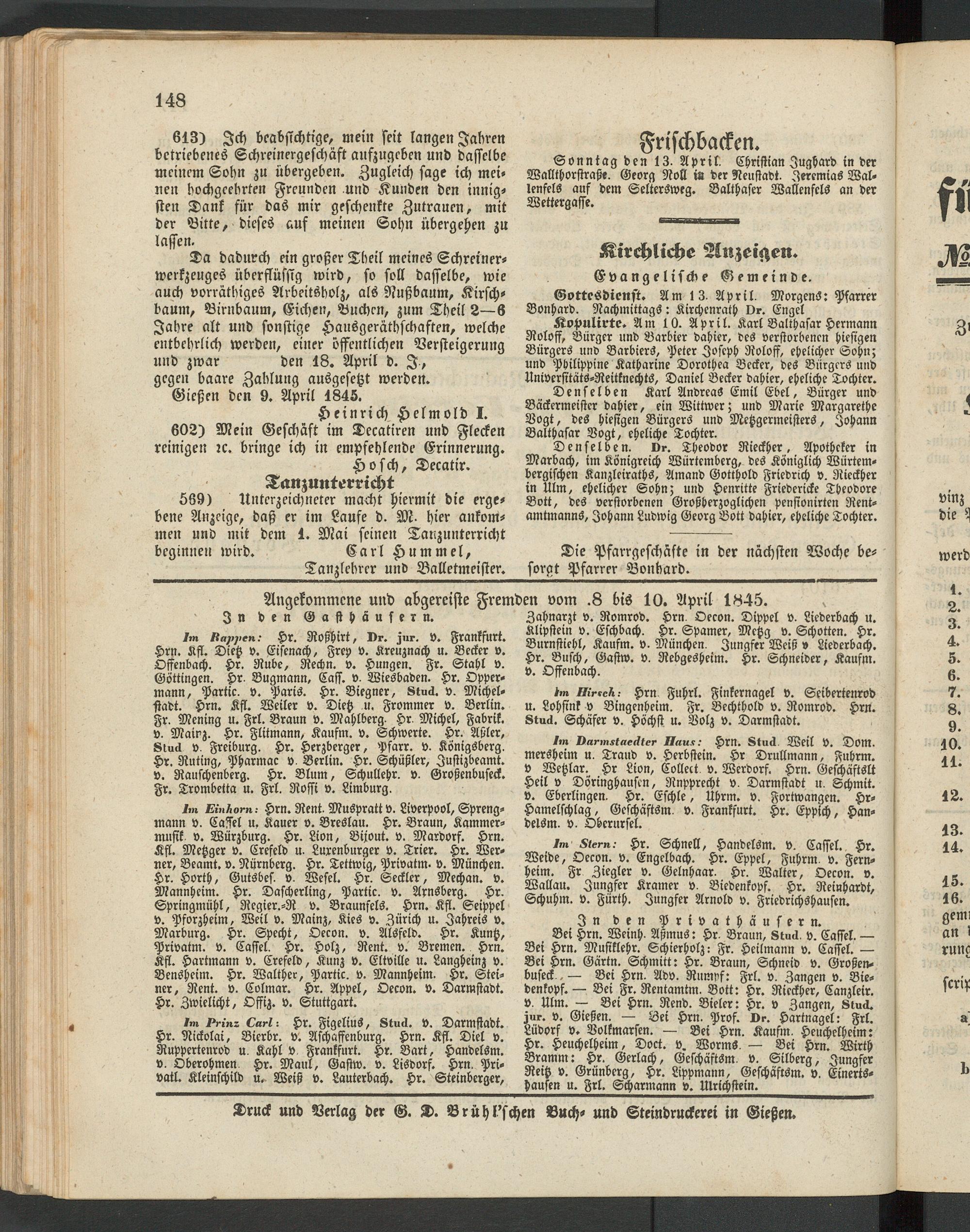 im Hirsch: Hrn Fuhr!. Finkernagel v. Seibertenrod u. Lohsink v Bingenheim. Fr. Bechthold v. Romrod. Hrn. Stud. Schäfer v. Höchst u. Volz v. Darmstadt.