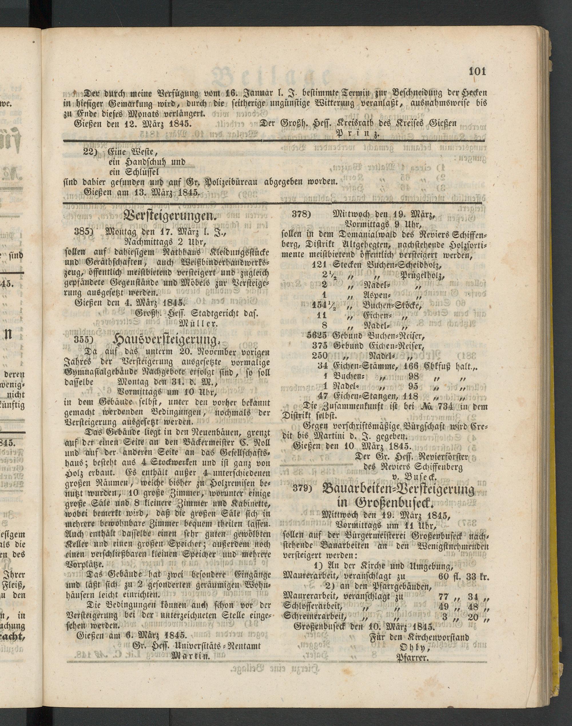 Mittwoch den 19. März 1845, Vormittags um 11 Uhr, sollen auf der Bürgermeisterei Großenbuseck nachstehende Bauarbeiten an den Wenigstnehmeuden versteigert werden: