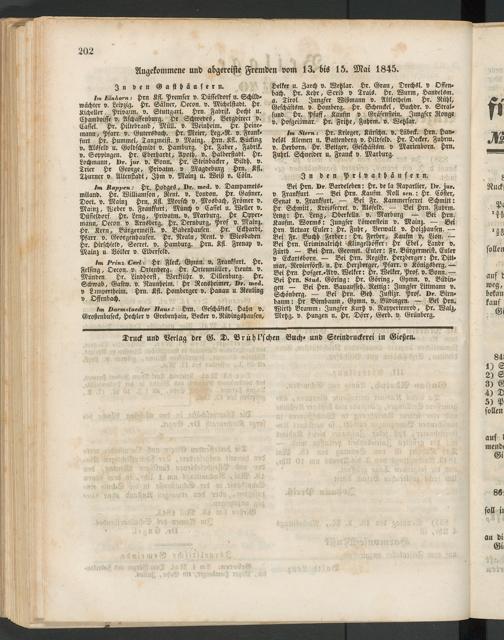 Bei Hrn. Dr. Bardeleben: Hr. de la Raparlier, Dr. jur. v. Frankfurt. — Bei Hrn. Kaufm. Noll sen.: Hr. Coster, Senat v. Frankfurt. — Bei Fr. Kammersecrct Schmitt: Hr. Schmitt, Kreissecret. v. Alsfeld. — Bei Hrn. Fuhrm. Leng: Hr. Leng, Oberkelln. v. Marburg — Bei Hrn. Kaufm. Worms: Jungfer Löwenstein v. Mainz. — Bei Hrn Actuar Euler: Hr. Fuhr, Verwalt, v. Holzhausen. — Bei Fr. Buchh. Ferber: Hr. Ferber, Kaufm v. Lion. — Bei Hrn. Criminalricht Klingelhöffer: Hr. Ebel, Landr v. Fürth — Bei Hrn. Geomet. Euler: Fr. Bürgermeist. Euler v Eckartsborn. — Bei Hrn. Registr. Herzberger: Hr. Ditt- mar, Revicrförst. u.Hr. Herzberger, Pfarr. v Königsberg.— Bei Hrn. Hofger.-Adv. Welker: Hr. Welker, Prof. v. Bonn. — Bei Hrn. Stud. Göring: Hr. Göring, Gpmn. v. Büdingen — Bei Hrn. Bauaufseh. Rettig: Jungfer Littmann v. Schönberg. — Bei Hrn. Geh Justizr. Prof. Dr. Birnbaum : Hr Birnbaum, Gpmn. v. Büdingen. — Bei Hrn. Wirth Bramm: Jungfer Kurtz v. Ruppertenrod, Hr. Walz, Metzg. v. Hungen u. Hr. Dörr, Gerb. v. Grünberg.