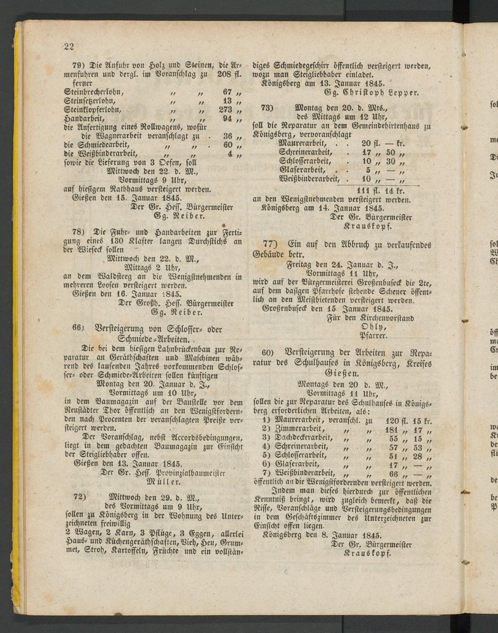 60) Versteigerung der Arbeiten zur Reparatur des Schulhauses in Königsberg, Kreises Gießen.