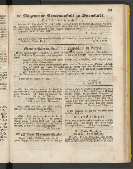 Zur Entgegennahme von Beitrittserklärungen und Ertheilung näherer Auskunft ist stets bereit Gießen im Oktober 1815. Z- ®> Appel.