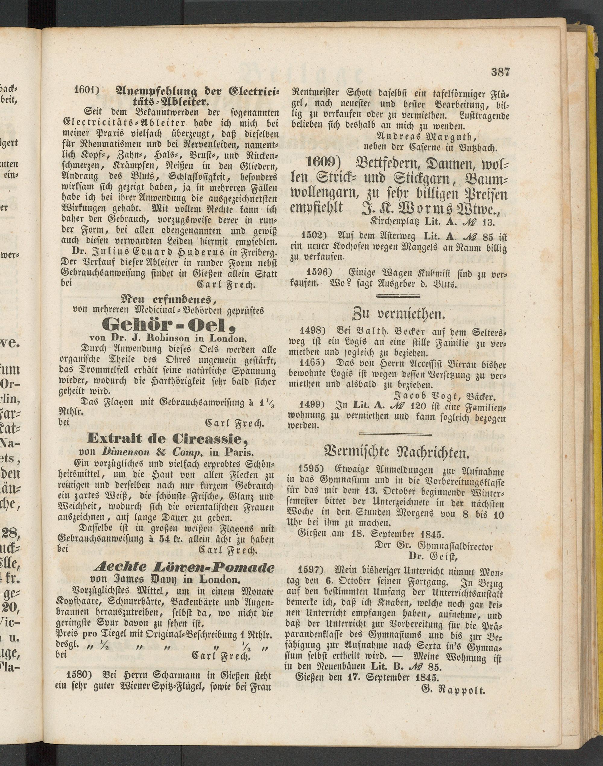 Dr. Julius Eduard Huderus in Freiberg. Der Verkauf dieser Ableiter in runder Form nebst Gebrauchsanweisung findet in Gießen allein Statt bei Carl Frech.