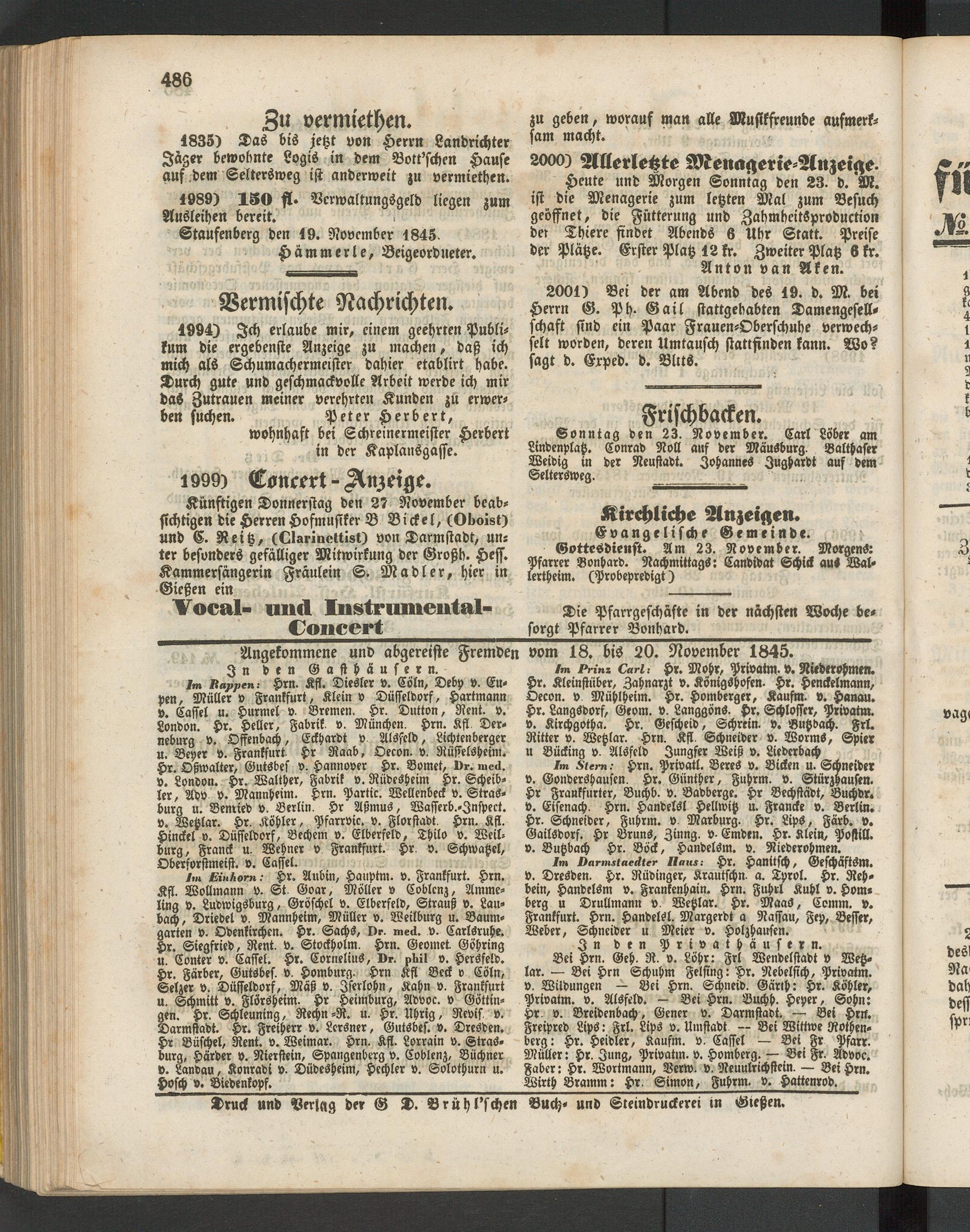 Bei Hrn. Geh. R. v. Löhr: Frl Wendelstadt v Wetzlar. — Bei Hrn Schuhm Felsing: Hr. Nebelsich, Privatm. v. Wildungen — Bei Hrn. Schneid. Gärth: Hr. Köhler, Privatm. v. Alsfeld. — Bei Hrn. Buchh. Heper, Sohn: Hr v. Breidenbach, Gener v. Darmstadt. — Bei Hr». Freipred Lips: Frl. Lips v. Umstadt — Bei Wittwe Rothenberg: Hr. Heidler, Kaufm. v. Caffel — Bei Fr Pfarr. Müller: Hr. Jung, Privatm. v. Homberg. — Bei Fr. Advoc. Faber: Hr. Worimann, Verw. v. Neuulrichstein. — Bei Hrn. Wirth Bramm: Hr. Simon, Fuhrm. v. Hattenrod.