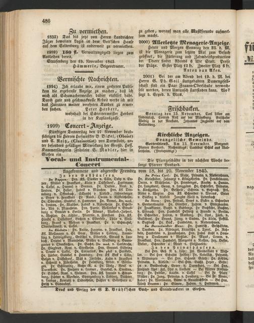 Künftigen Donnerstag den 27 November beabsichtigen die Herren Hofmusikcr B Bickel, (Oboist) und C. Reitz, (Clarinettist) von Darmstadt, unter besonders gefälliger Mitwirkung der Großh. Hess. Kammersängerin Fräulein S. Madler, hier in Gießen ein