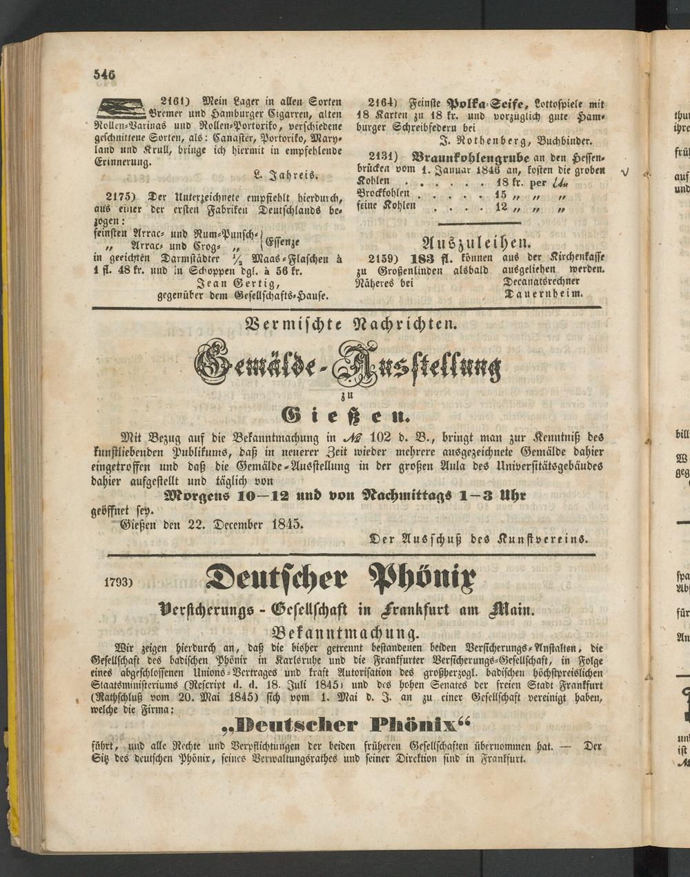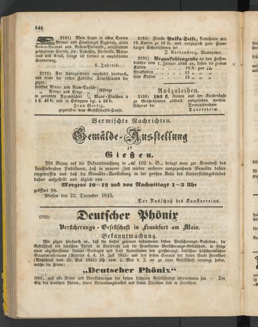 Wir zeigen hierdurch an, daß die bisher getrennt bestandenen beiden Versicherungs-Anstalten, die Gesellschaft des badischen Phönir in Karlsruhe und die Frankfurter Versicherungs-Gesellschaft, in Folge eines abgeschlossenen Unions- Vertrages und kraft Autorisation des großherzogl. badischen höchstpreislichen Slaatsministeriums (Rcscript <1. d. 18. Juli 18451 und des hohen Senates der freien Stadt Frankfurt (Rathschluß vom 20. Mai 1845) sich vom 1. Mai d. I. an zu einer Gesellschaft vereinigt haben, welche die Firma: