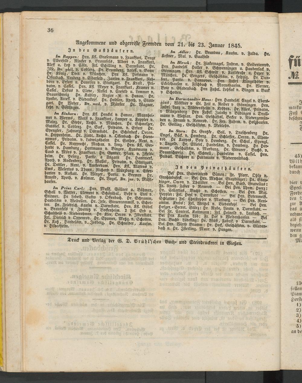 Angekommcne und abgereiste Fremden vom 21. bis 23. Januar 1845.