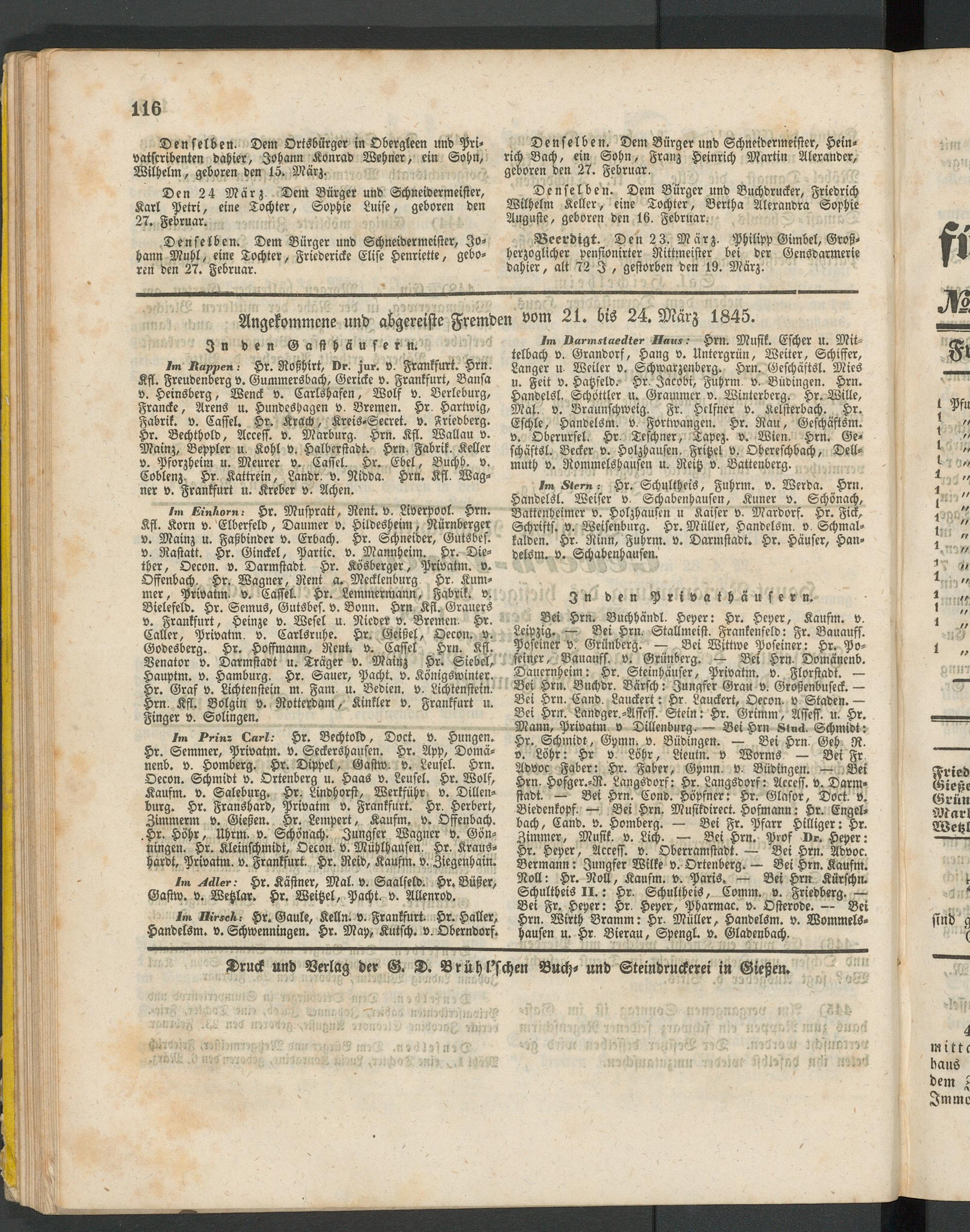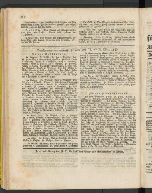 Bei Hrn. Buchhändl. Hcper: Hr. Heper, Kaufm. v. Leipzig. — Bei Hrn. Stallmeist. Frankenfeld: Fr. Bauaufs. Poseiner v. Grünberg. — Bei Wittwe Poseiner: Hr. Po- sciner, Bauaufs. v. Grünberg. — Bei Hrn. Domäncnb. Danernheim: Hr. Steinhäuser, Privatm. v. Florstadt. — Bei Hrn. Buchdr. Bärsch: Jungfer Grau v. Großenbuseck. — Bei Hrn. Cand. Lauckert: Hr. Lauckert, Oecon. v Staden. — Bei Hrn. Landger.-Asscss. Stein: Hr. Grimm, Affeff. u. Hr. Mann, Privatm. v Dillenburg. — Bei Hrn Sind. Schmidt: Hr. Schmidt, Gpmn. v. Büdingen. — Bei Hrn. Geh. R. v. Löhr: Hr v. Löhr, Lieutn. v Worms — Bei Fr. Advoc Faber: Hr. Faber, Gpmn. v. Büdingen. — Bei Hrn. Hofger.-R. Langsdorf: Hr. Langsdorf: Access, v. Darmstadt. — Bei Hrn. Cond. Hopfner: Hr. Glasor, Doct. v. Biedenkopf. — Bei Hrn. Musikdirect. Hofmann: Hr. Engelbach, Cand. v. Homberg. — Bei Fr. Pfarr Hilliger: Hr. Zimmer, Mufik. v. Lich. — Bei Hrn. Prof Dr. Heper: Hr. Heper, Access, v. Obcrramstadt. — Bei Hrn. Advoc. Bermann: Jungfer Wilke v. Ortenberg. — Bei Hrn. Kaufm. Noll: Hr. Noll, Kaufm. v. Paris. — Bei Hrn Kürschn. Schultheis II.: Hr. Schultheis, Comm. v. Friedberg. — Bei Fr. Heper: Hr. Heper, Pharmac. v. Osterode. — Bei Hrn. Wirth Bramm: Hr. Müller, Handelsm. v. Wommelshausen u. Hr. Bierau, Spengl. v. Gladenbach.