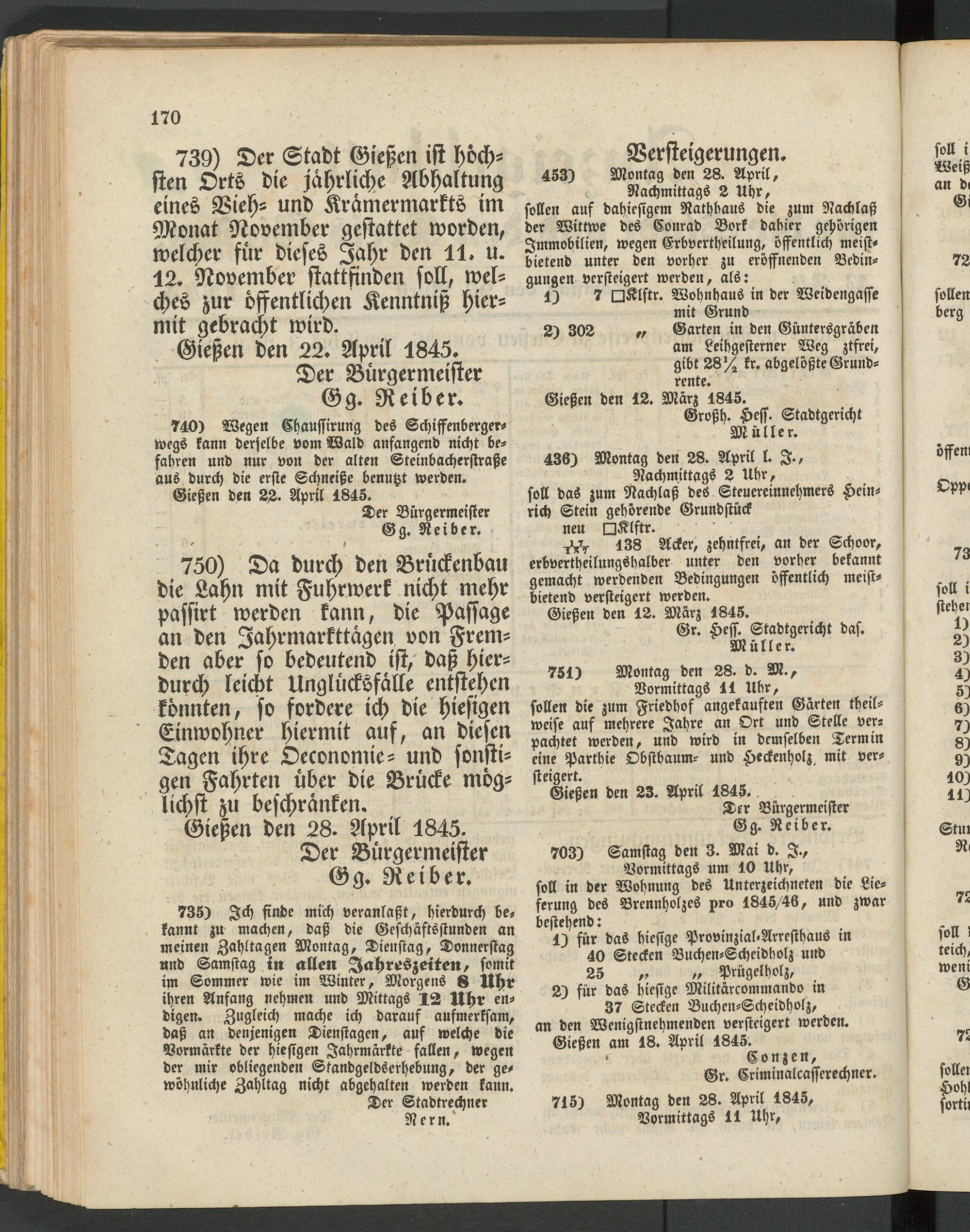 37 Stecken Buchen-Scheidholz, an den Wenigstnchmenden versteigert werden. Gießen am 18. April 1845.