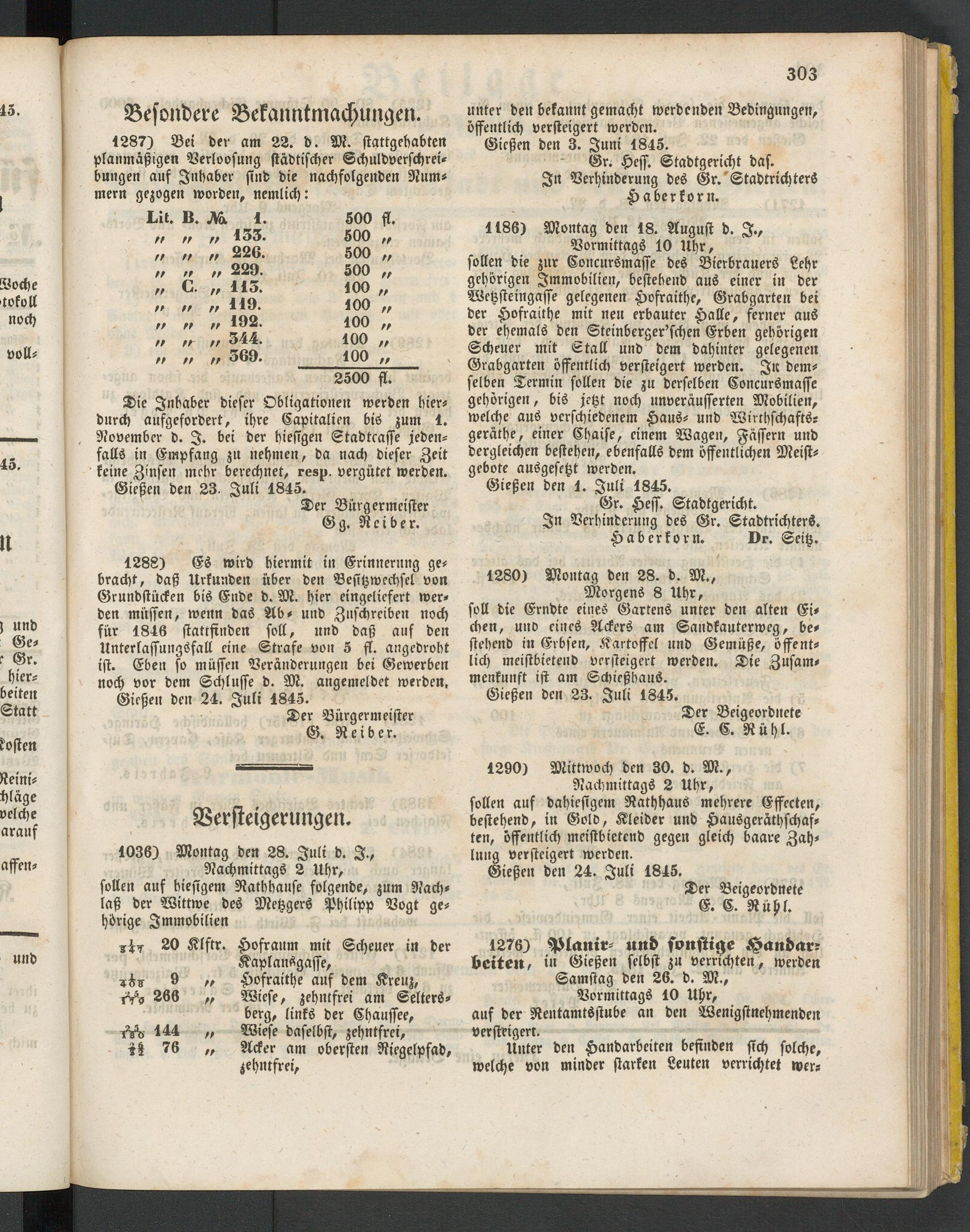 1288) Es wird hiermit in Erinnerung gebracht, daß Urkunden über den Besitzwechsel von Grundstücken bis Ende d. M. hier eingeliefert werden müssen, wenn das Ab« und Znschrciben noch für 1846 stattfinden soll, und daß auf den Unterlassungsfall eine Strafe von 5 ft. angcdrokt ist. Eben so müssen Veränderungen bei Gewerben noch vor dem Schlüsse d. M. angemeldet werden, Gießen den 24. Juli 1845.