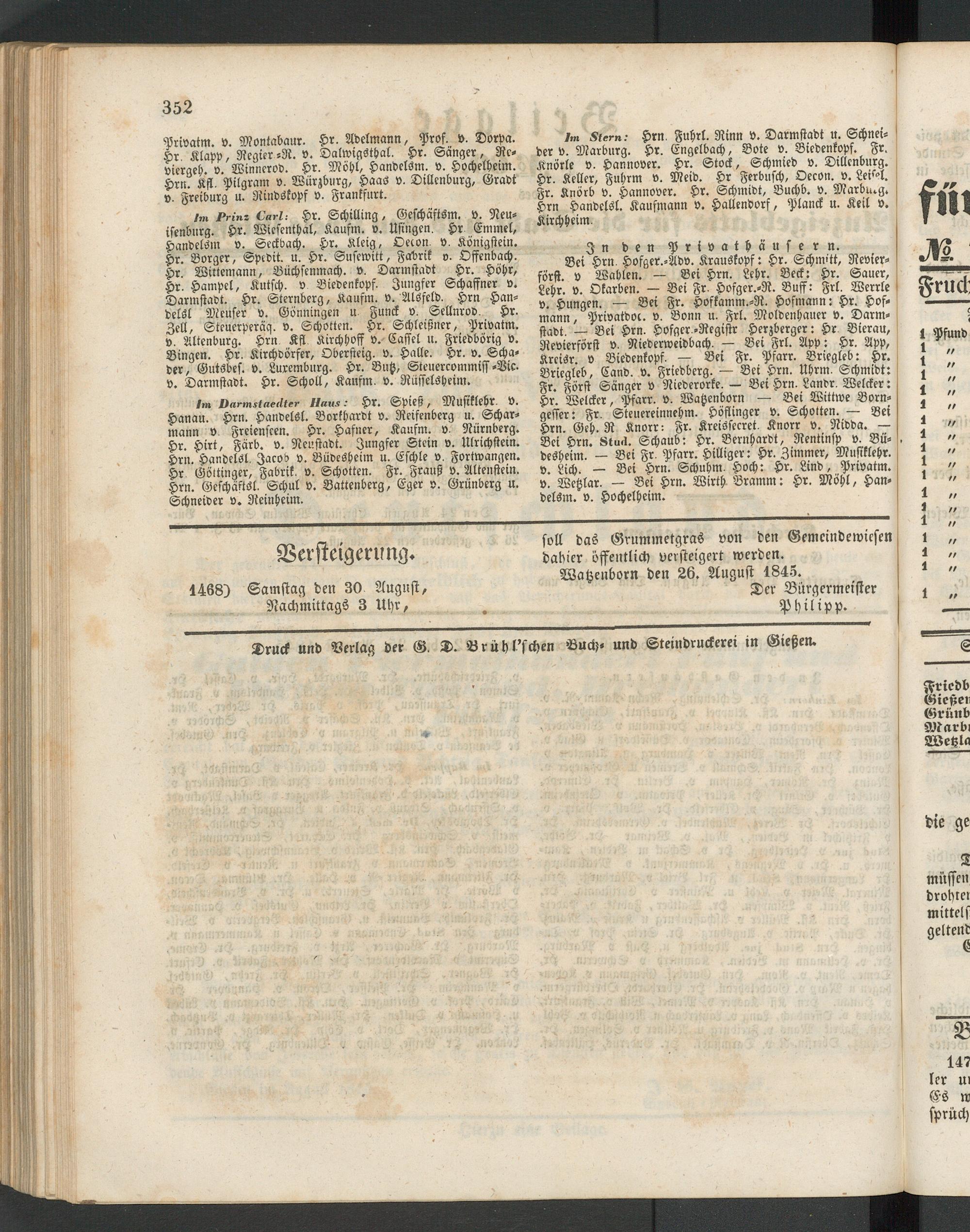 Im Darmstaedter Haus: Hr. Spiest, Muflktehr v. Hanau. Hrn. Handelsl. Borthardt v. Reifenberg u. Scharmann v Freienscen. Hr. Hafner, Kaufm. v. Nürnberg. Hr. Hirt, Färb. v. Neustadt. Jungfer Stein v. Ulrichstein. Hrn. Handelst. Jacob v. Büdesheim u. Eschle v. Fortwangen. Hr Göltinger, Fabrik, v. Schotten. Fr. Franst v. Altenstein. Hrn. Geschärtsl. Schul v. Battenberg, Eger v. Grünberg u. Schneider v. Reinheim.