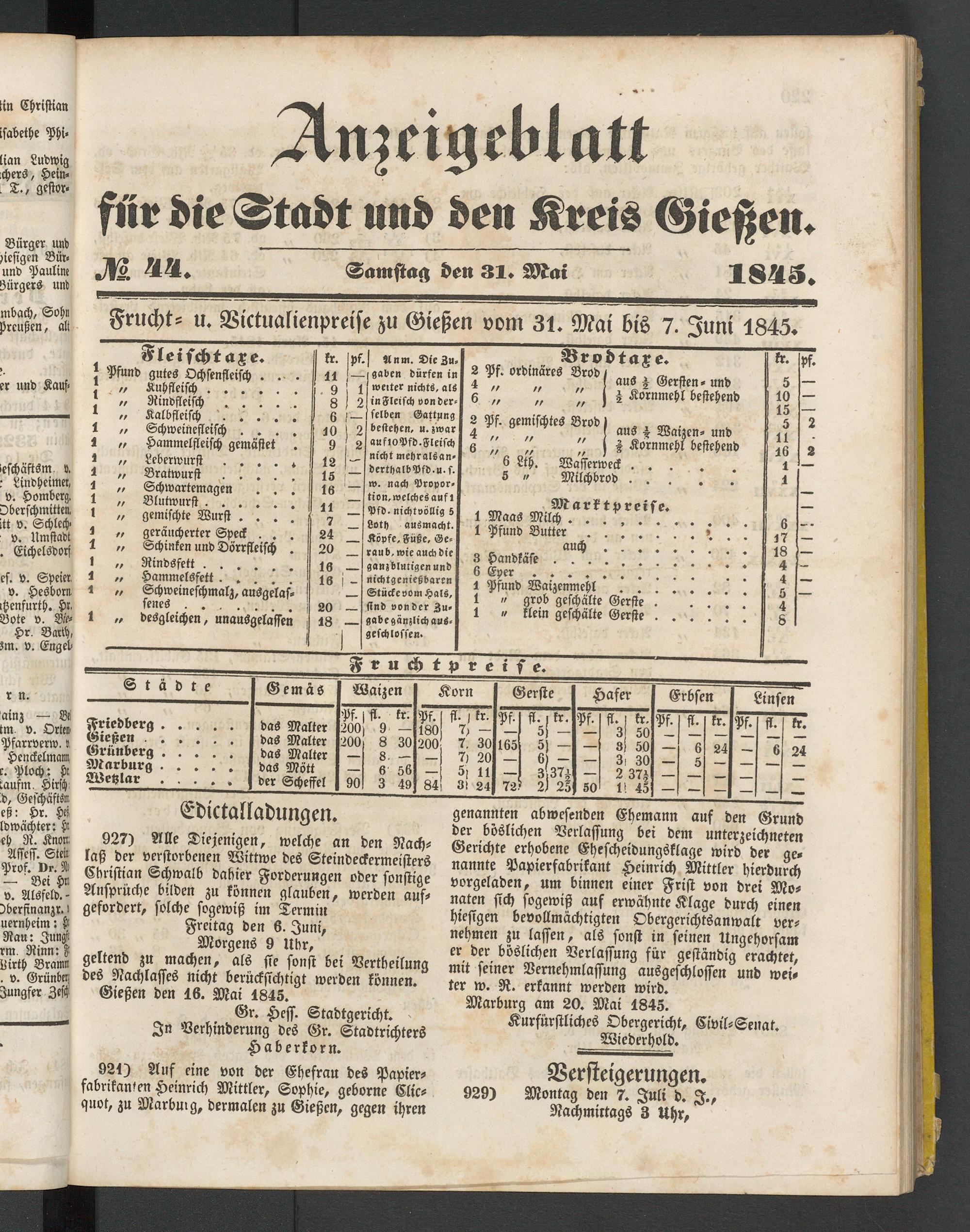 Frucht- u. Victuasienpreise zu Gießen vom 31. Mai bis 7. Juni 1845.