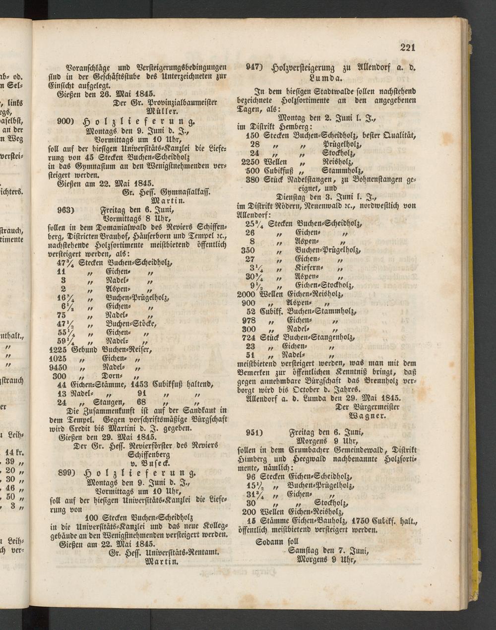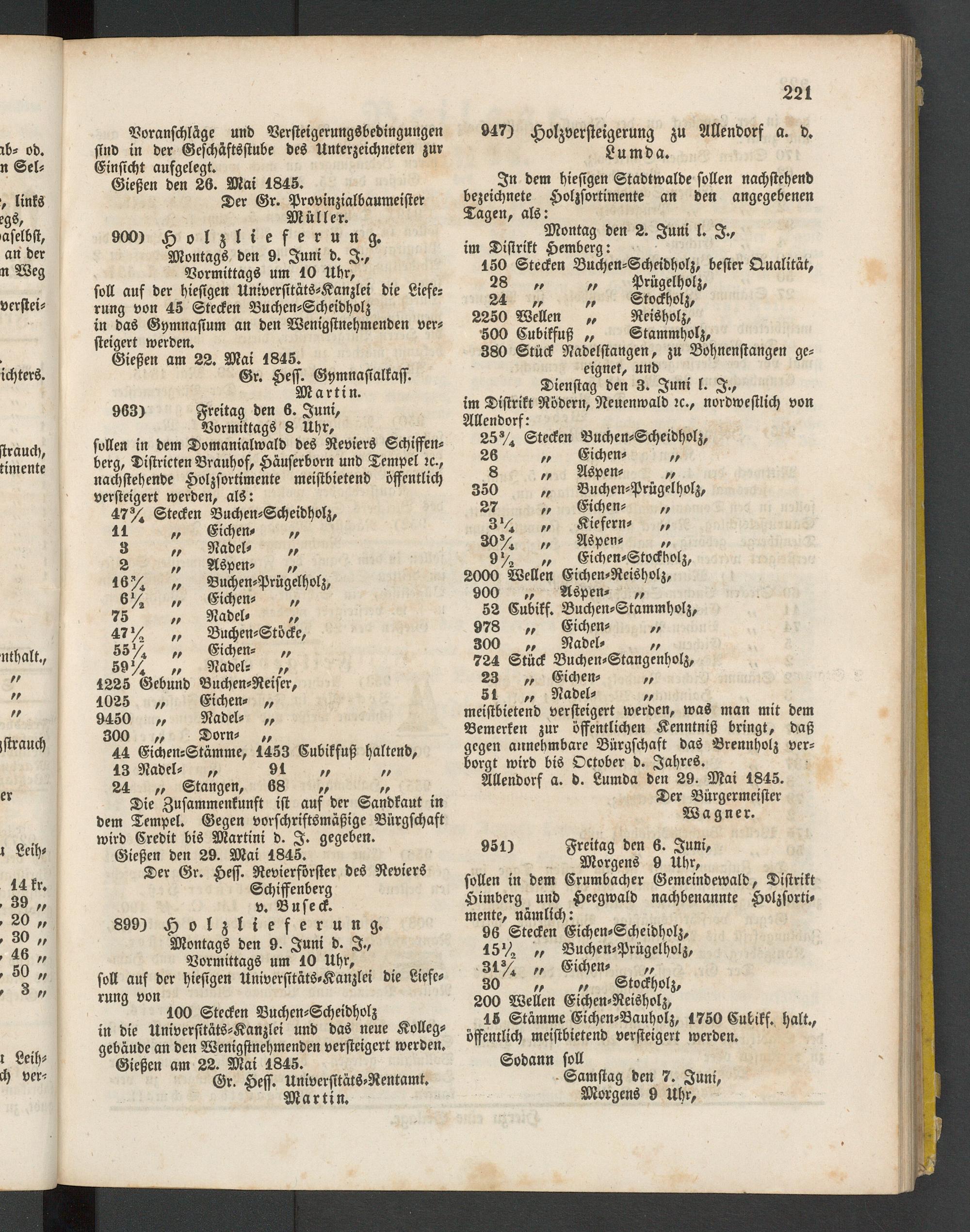100 Stecken Buchen-Scheidholz in die Universitäts-Kanzlei und das neue Kolleggebäude an den Wenigstnehmenden versteigert werden. Gießen am 22. Mai 1845.