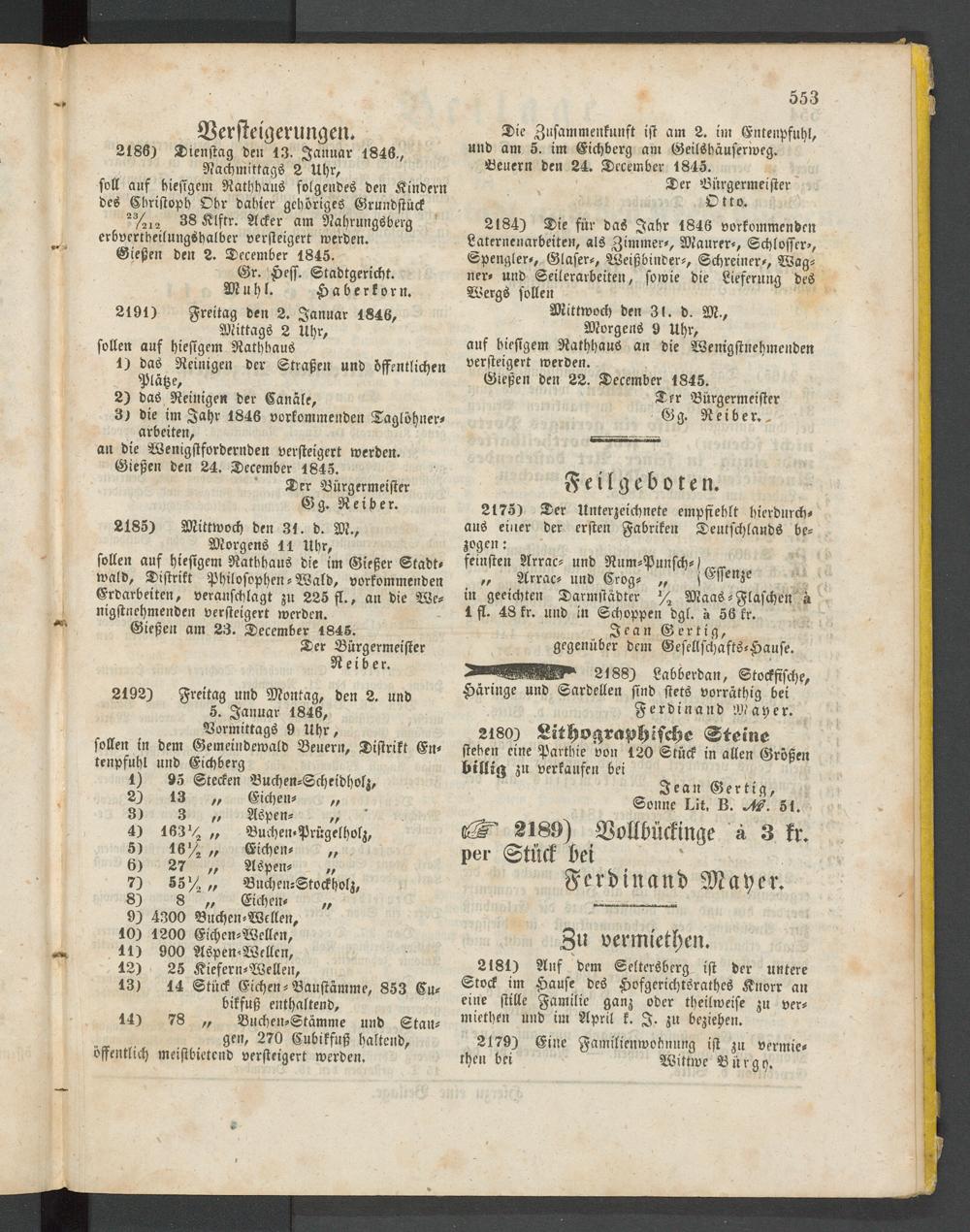 an die Wenigstfordcrnden versteigert werden. Gießen den 24. December 1845.