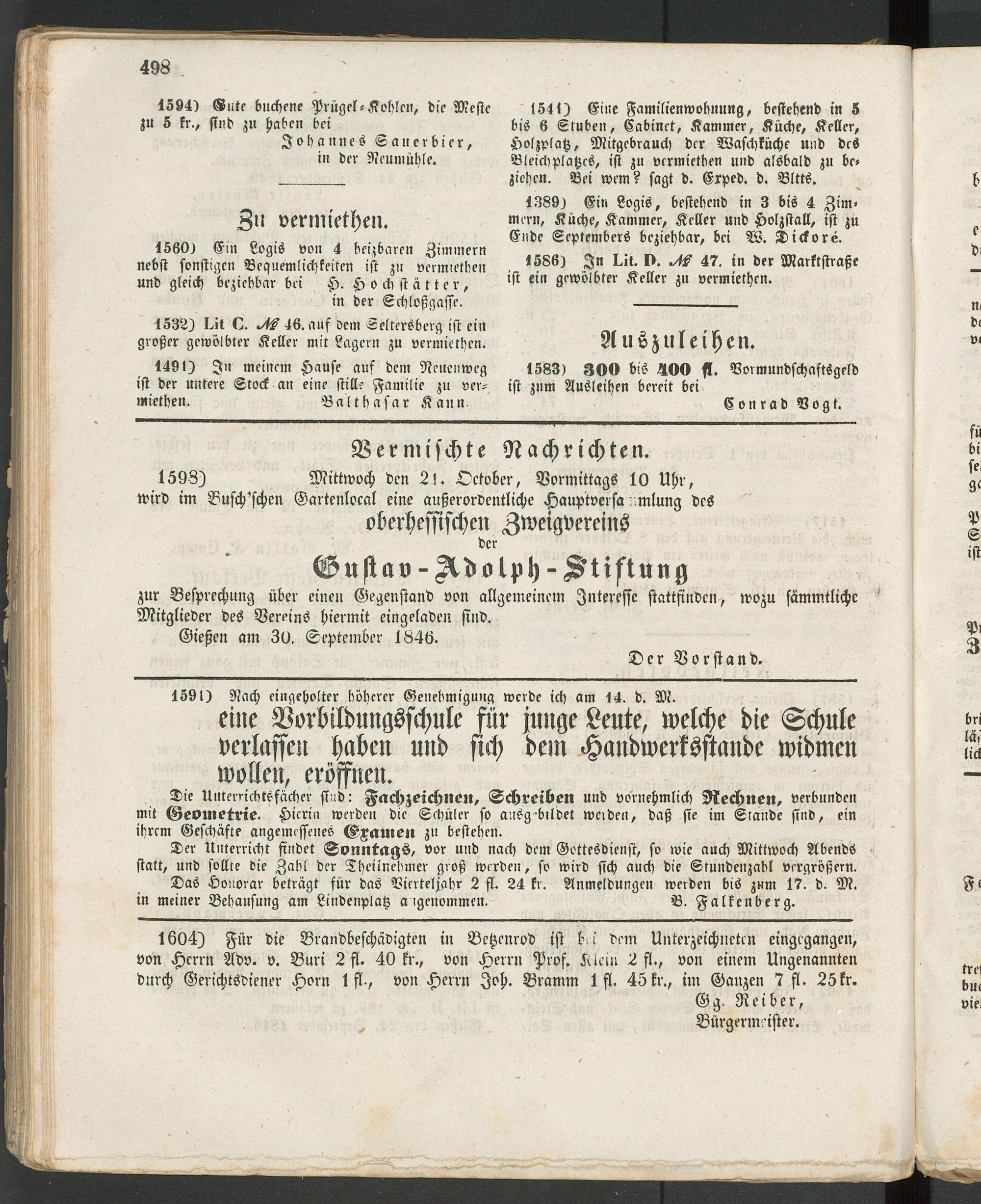 1604) Für die Brandbeschädigten in Betzenrod ist twi dem Unterzeichneten eingegangen, von Herrn Adv. v. Buri 2 fl. 40 fr., von Herrn Prof. Le lein 2 fl., von einem Ungenannten durch Gerichtsdiener Horn 1 fl., von Herrn Joh. Bramm 1 fl. 45 kr., im Ganzen 7 fl. 25 fr.