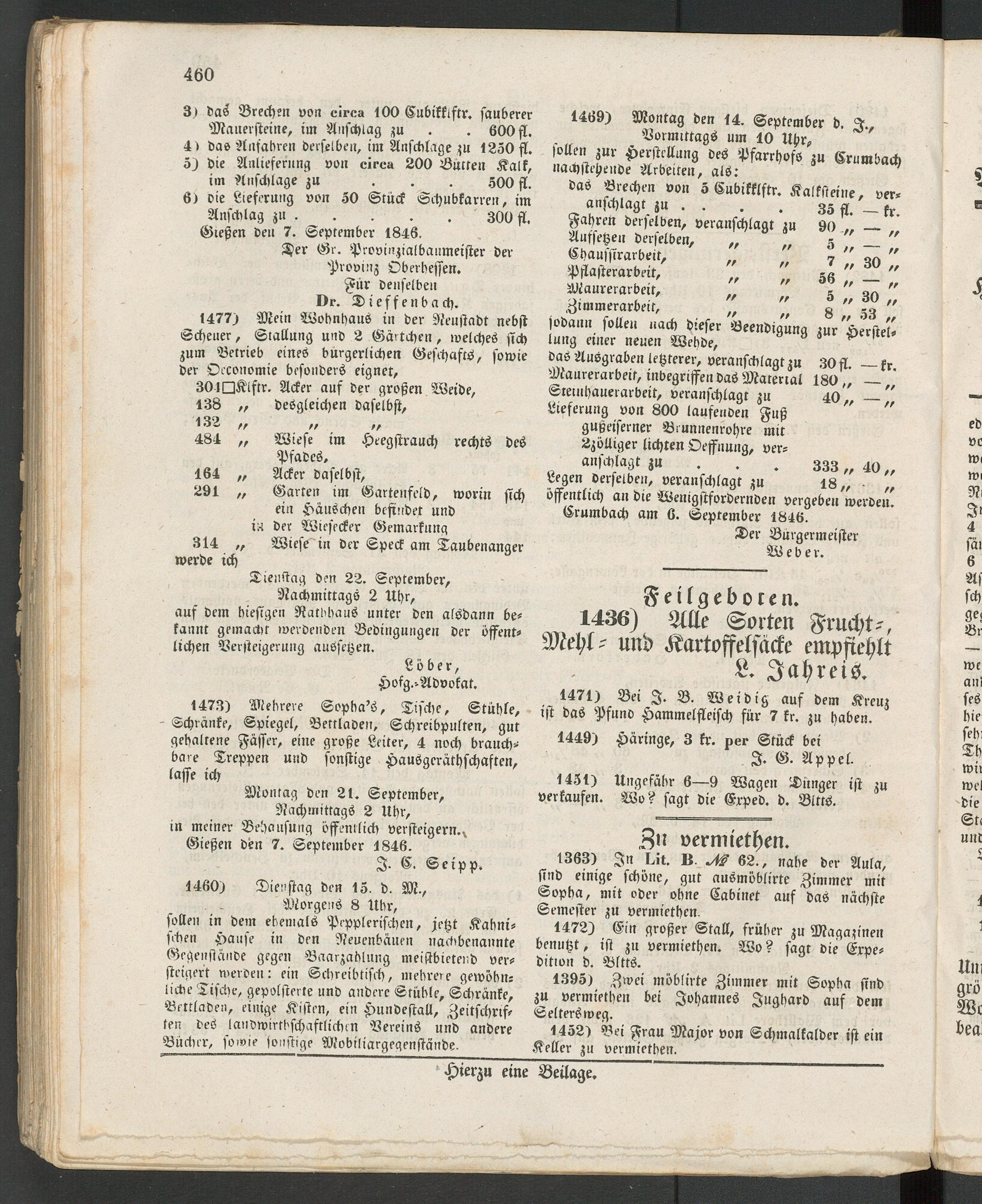 1395) Zwei möblirte Zimmer mit Sopba sind zu vermiethen bei Johannes Zughard auf dem Seltersweg.