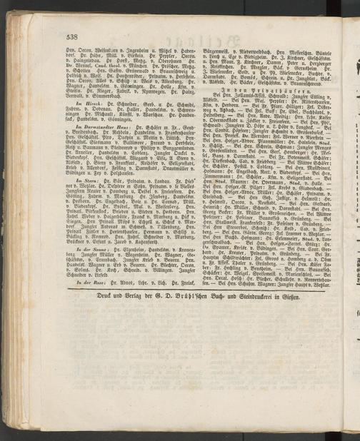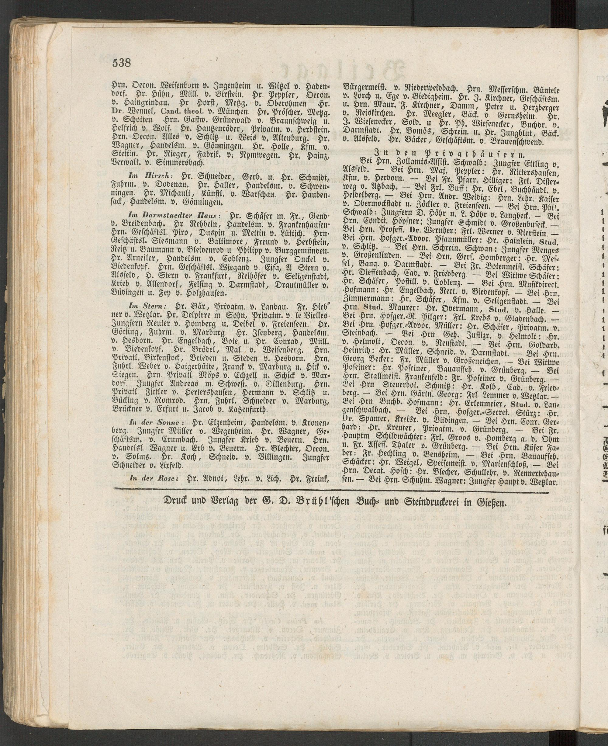 Im Darmstaedter Haus: Hr. Schäfer M. Fr., Gelld' v. Breidenbach. Hr Rehbein, Handelsm. v. Frankenhausen' Hrn. Geschäftsl. Piro, Duspin u. Mettin v. Lüttich. Hrn- Geschäftsl. Siesmann v. Baltimore, Freund v. Herbstein, Reitz u. Baumann v. Bleidenrod u Philipp v. Burggemünden. Hr. Arneiler, Handelsm v. Coblenz. Jungfer Onckel v. Biedenkopf. Hrn. Geschäftsl. Wiegand v. Eifa, A Stern v. Alsfeld, H. Stern v- Frankfurt, Reihöfer v. Seligenstadt, Krieb v. Allendorf, Felflng v. Darmstadt, Drautmüller v. Büdingen u. Fey v. Holzhausen.