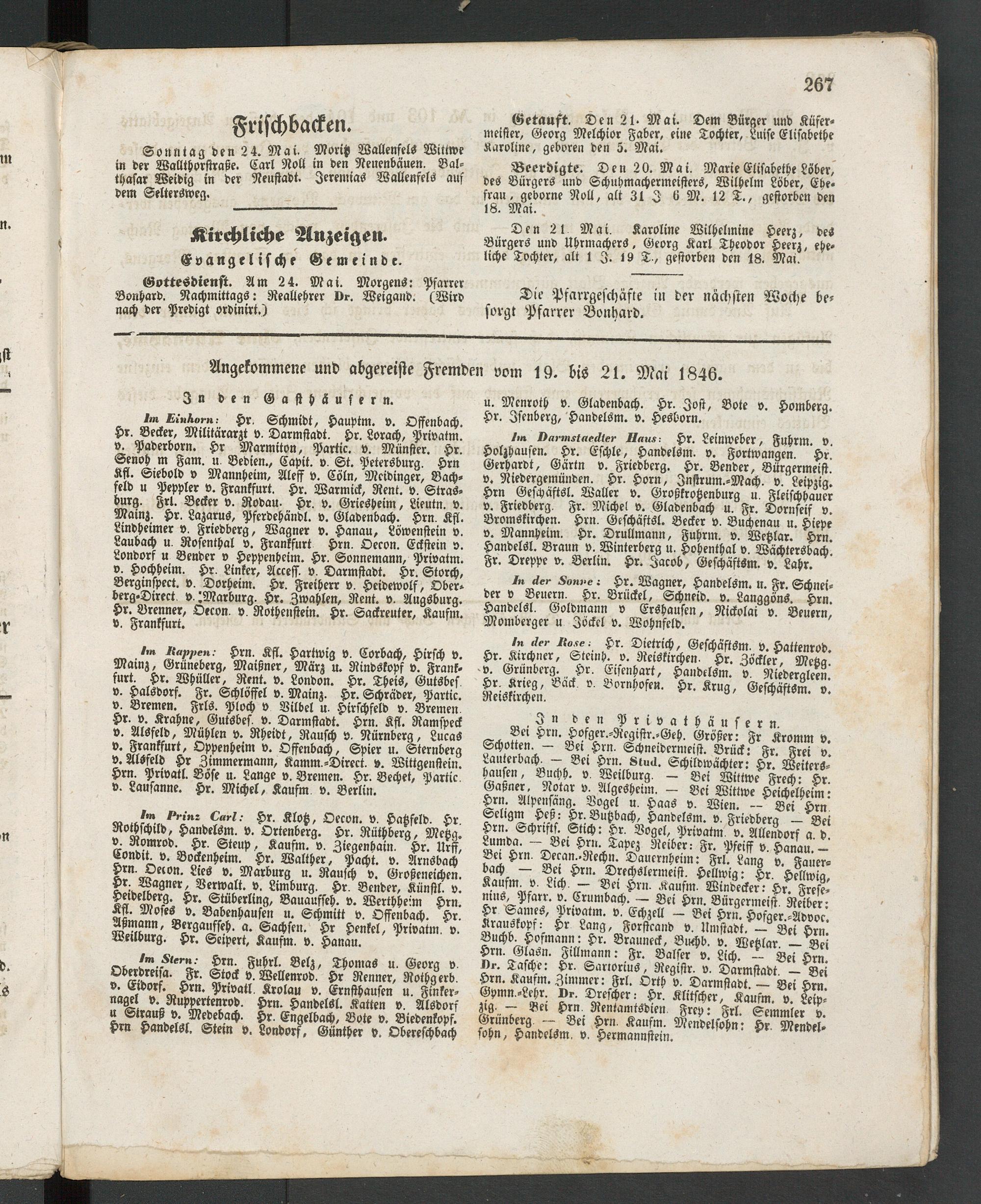 Angekommene und abgereiste Fremden vom 19. bis 21. Mai 1846.