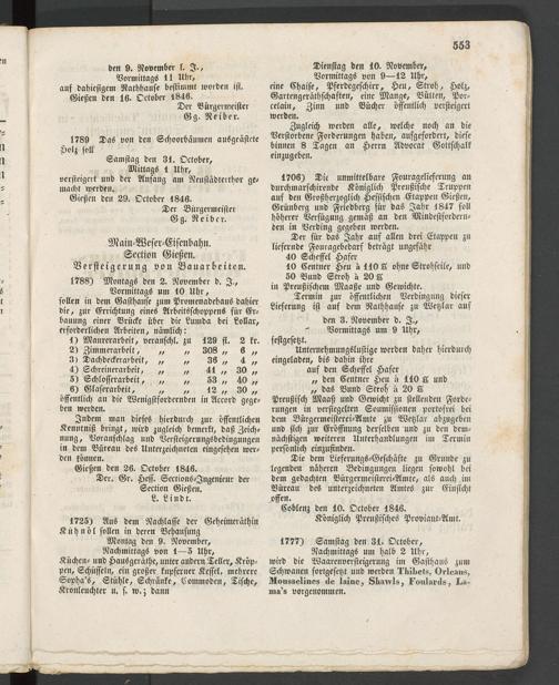 den 9. November l. I., Vormittags 11 Uhr, auf dahiesigem Nathhause bestimmt worden ist. Gießen den 16. Oktober 1846.