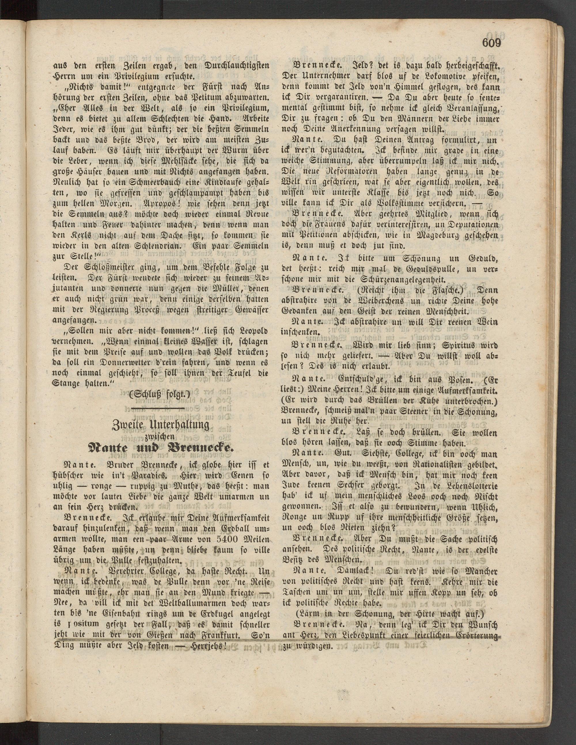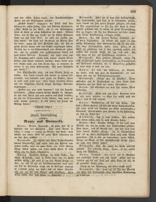 Nante. Gut. Siehste, College, tck bin ooch man Mensch, un, wie du weeßl, von Rationalisten gebildet. Aber davor, daß ick Mensch bin, hat mir noch feen Jude keenen Sechser geborgt. In de Lebenslvtterie hab' ick uf mein menschliches Loos ooch noch Nischt gewonnen. Iss et also zu bewundern, wenn Uhlich, Ronge un Rupp uf ihre menschheitliche Größe setzen, un ooch blos Mieten ziehn?