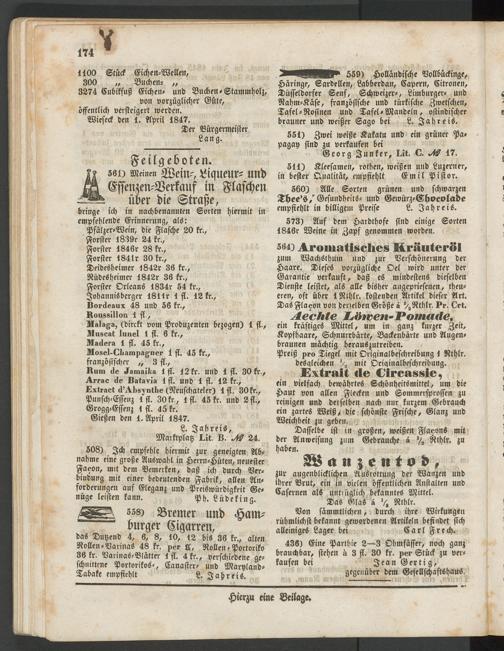 Rum de Jamaika 1 fl. 12 fr. und 1 fl. 30 fr., Arrac de Batavia 1 fl. und 1 fl. 12 fr., Bxtraet d'Absinthe (Neuschateler) I fl. 30fr., Punsch-Essenz 1 fl. 30fr., Ifl. 45 fr. und 2fl., Grogg-Essenz 1 fl. 45 fr.