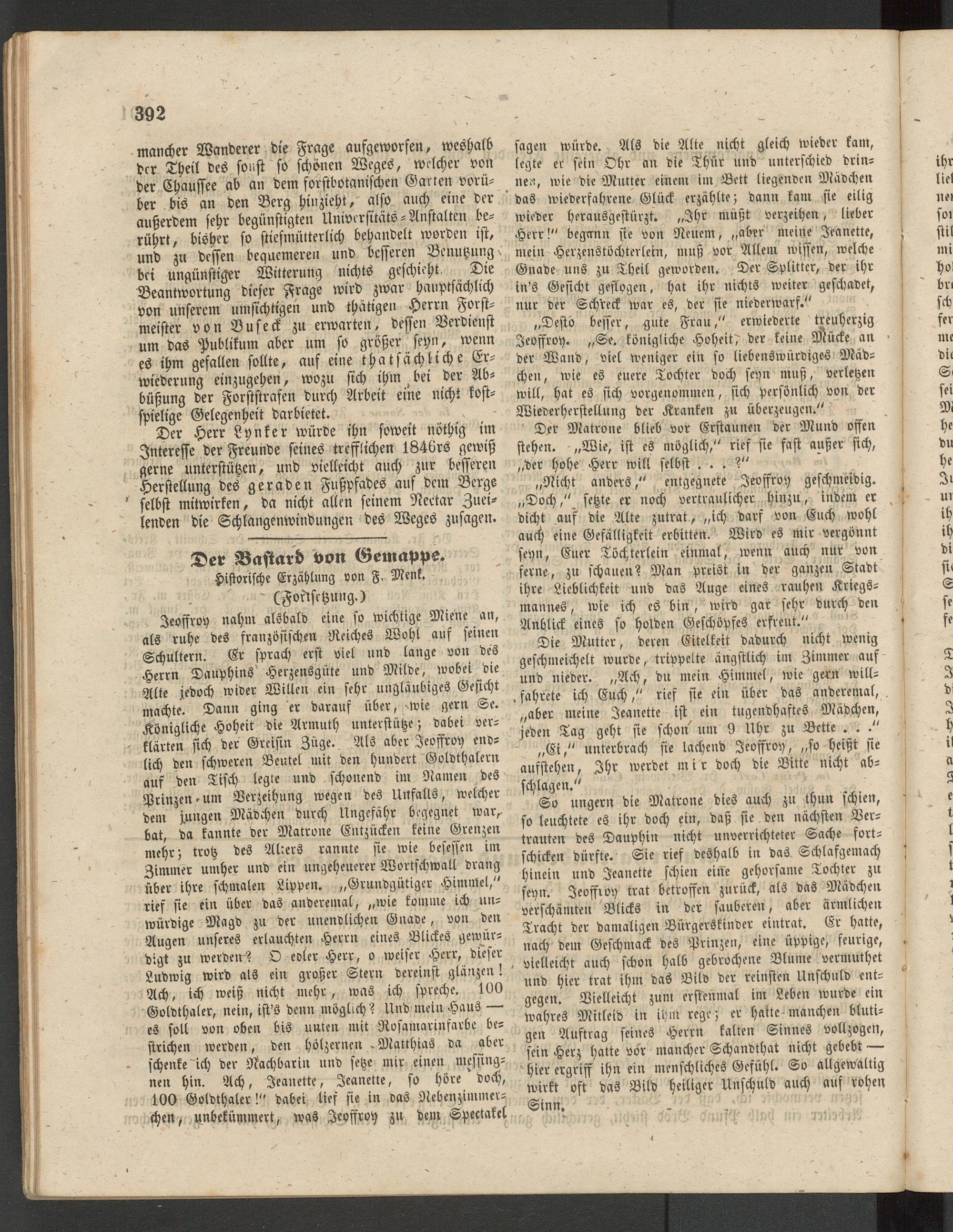 Die Mutter, deren Eitelkeit dadurch nicht wenig geschmeichelt wurde, trippelte ängstlich im Zimmer auf und nieder. „Ach, du mein Himmel, wie gern will- . fahrete ich Euch," rief sie ein über das anderemal, „aber meine Jeanette ist ein tugendhaftes Mädchen, jeden Tag geht sie schon um 9 Uhr zu Bette ._. ." „Ei," unterbrach sie lachend Jeoffroy, „so heißt sie aufstehen, Ihr werdet m i r doch die Bitte nicht abschlagen."