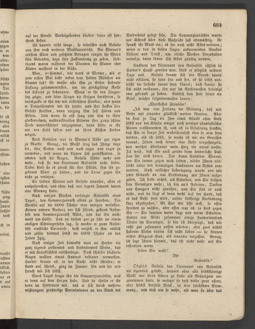 Nachdem der Lieutenant von Rosenfeld tählich in Harder's Hause gewesen war, blieb er plötzlich mehrere Tage aus. Rosalie konnte sich den Grund davon nicht erklären, sie sann hin und her, ob sie selbst vielleicht die Ursache davon seyn könnte; doch konnte sie sich nicht entsinnen, ihn nur im Entferntesten beleidigt oder gekränkt zu haben. Endlich kam statt seiner ein Brief, welcher folgendermaßen lautete.: