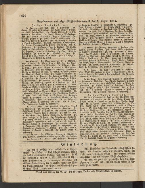 Im Einhorn: Hr. Oppermann IN. Fr. u Schwest, Doet. v. Haina. Hr.. Greve, Kfm .v. Osterode. Hr. Fischer m. Bedien., Staatsr. v. Birkenfeld. Hr. Schwabe, Kfm. v. Leipzig. Hrn. Rent. (Stiften v. London u. Wittringham v. Milwankil. Hrn. Kfl. Purgold v. Hamburg, Feldstein v. Berlin u. Quilguer m. Fam. u. Bedien, v. Rio-Janeiro Hr. Werrem, Doet. v. Cöln. Hr. Baron v. Westfeld m. Bedien, Partie, v. Danzig. Hr. Krieger m. Tocht, Fabrik, v Offenbach. Fr. Baron v. Krubp m. Schwest. u. Bedien, v. Braunschweig. Hr. Hummel m. Locht, Balletmeist. v. Mainz. Hr Meerholz, Fabrik, v. Offenbach. Hr. Aleff, Kfm. v. Cöln. Hr Muller, Past. v. Altenkirchen. Fr. Rent. Fregbe m Tocht. v. Wildungen. Hr. Freiherr v. Bopnedorf m. Fam. u. Bedien., Gener. v Breslau. Graf zu Reichenbach-Delmenhorst m Bedien., Rent. v. Delmenhorst. Hr. Oppenheim, Advoc. v. Limburg Hr Schöllhorn, Gutsbes. v. Forst. Hr. Heß, Apoth. v. Marburg. Hr. Hummel, Fabrik, v. Solingen. Hr v Knappstadt, Gutsbes u. Hr. v. Weifenburg, Rent. v. Carlsruhe. Hr. v. Heidewolf, Oberger -Direct. v. Marburg Hr. Arens, Kfm. v. Mainz. Hr. Wiedemann, Registr. v. Darmstadt.