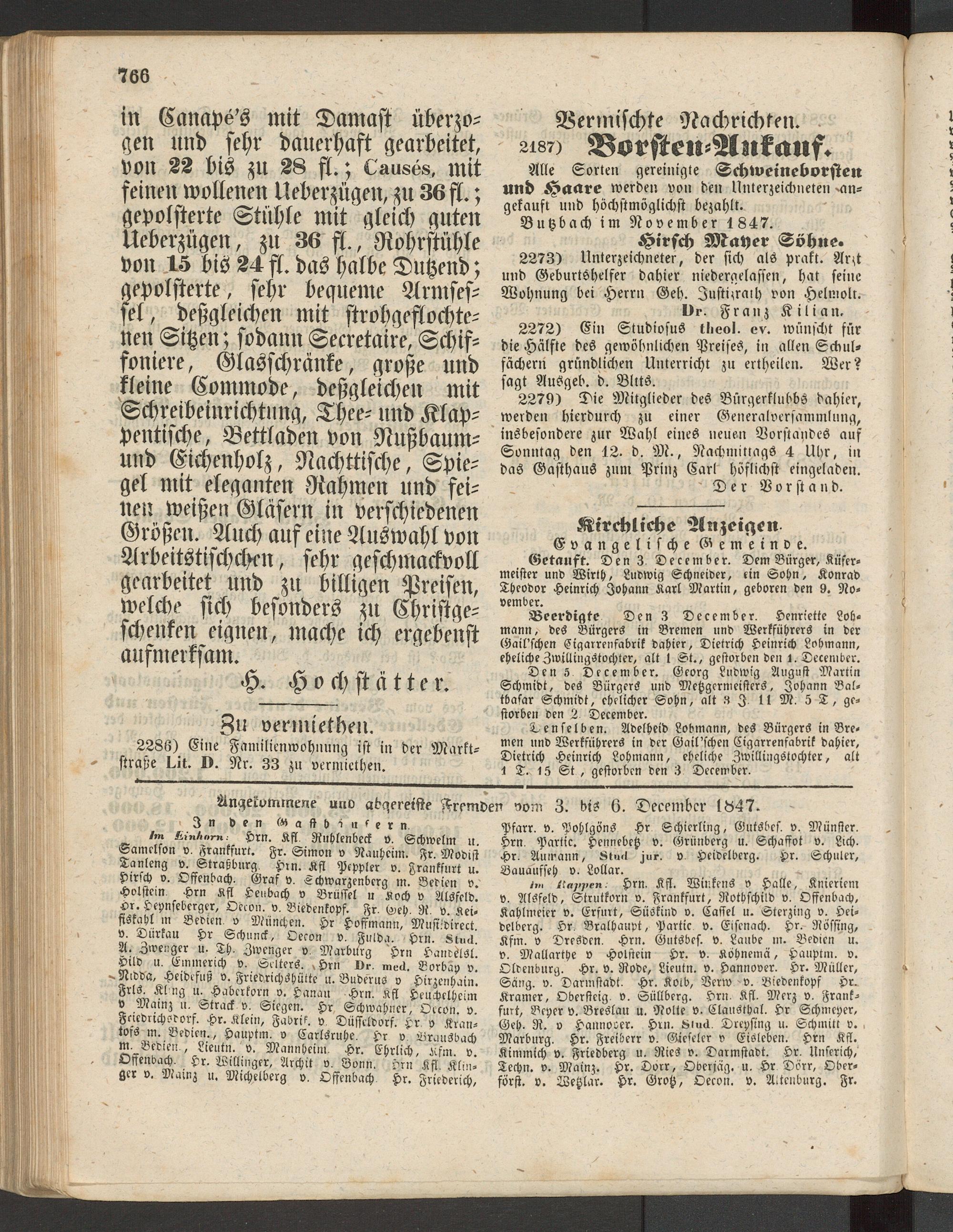 2273) Unterzeichneter, der sich als prakt. Ar^t und Geburtshelfer dahier niedergelassen, hak seine Wohnung bei Herrn Geh. Justiwaih von Helmoli.