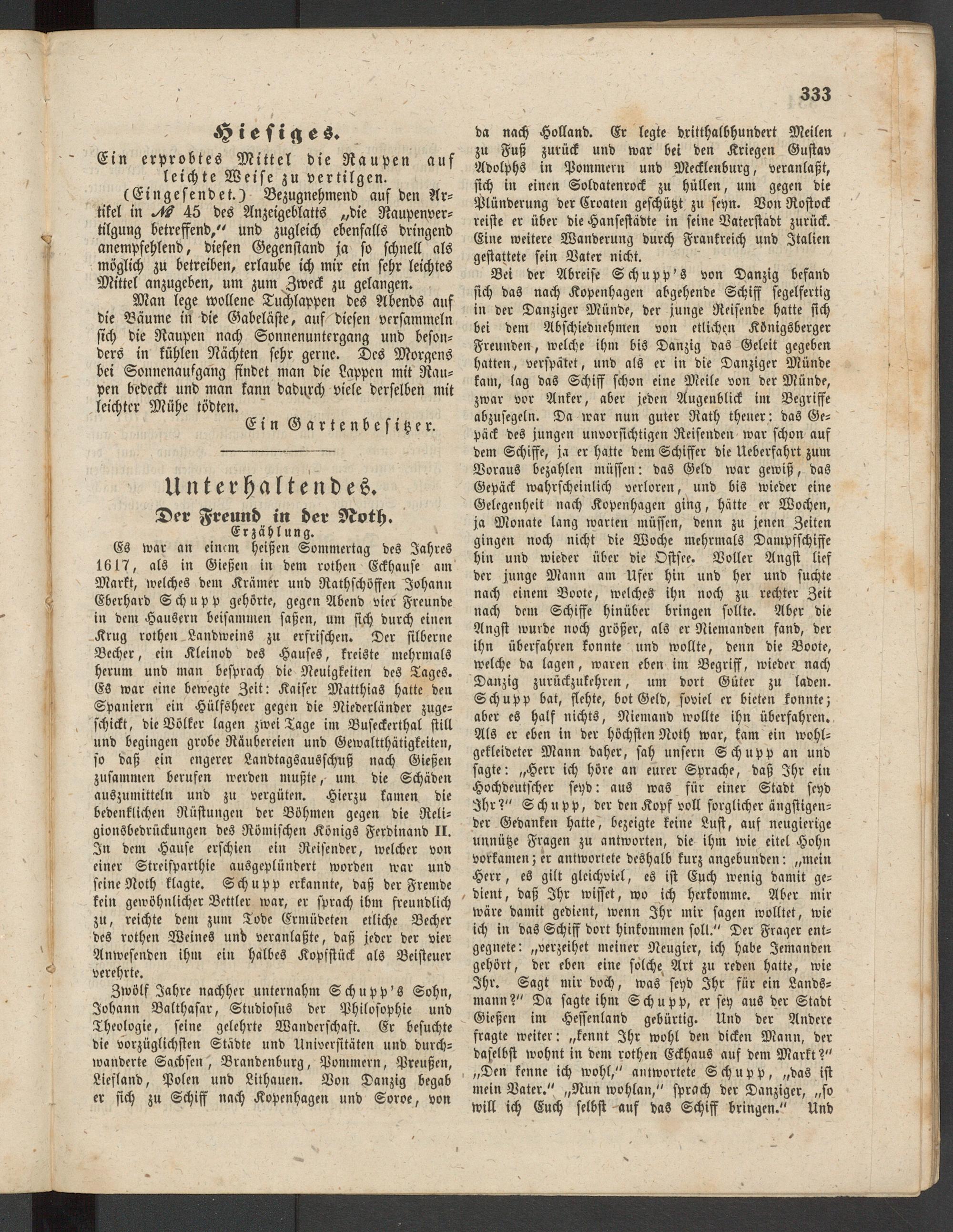 Es war an einem heißen Sommertag des Jahres 1617, als in Gießen in dem rothen Eckhanse am Markt, welches dem Krämer und Rathschöffen Johann Eberhard Schupp gehörte, gegen Abend vier Freunde in dem Hausern beisammen saßen, um sich durch einen Krug rothen Landweins zu erfrischen. Der silberne Becher, ein Kleinod des Hauses, kreiste mehrmals herum und man besprach die Neuigkeiten des Tages. ES war eine bewegte Zeit: Kaiser Matthias hatte den Spaniern ein Hülfsheer gegen die Niederländer zugeschickt, die Völker lagen zwei Tage im Buscckerthal still und begingen grobe Räubereien und Gewaltthätigkeiten, so daß ein engerer Landtagsausschuß nach Gießen zusammen berufen werden mußte, um die Schäden auszumitteln und zu vergüten. Hierzu kamen die bedenklichen Rüstungen der Böhmen gegen die Religionsbedrückungen des Römischen Königs Ferdinand II. In dem Hause erschien ein Reisender, welcher von einer Streisparthie ausgeplündert worden war und seineNoth klagte. Schupp erkannte, daß der Fremde kein gewöhnlicher Bettler war, er sprach ihm freundlich zu, reichte dem zum Tode Ermüdeten etliche Becher des rothen Weines unt> veranlaßte, daß jeder der vier Anwesenden ihm ein halbes Kopfstück als Beisteuer verehrte.
