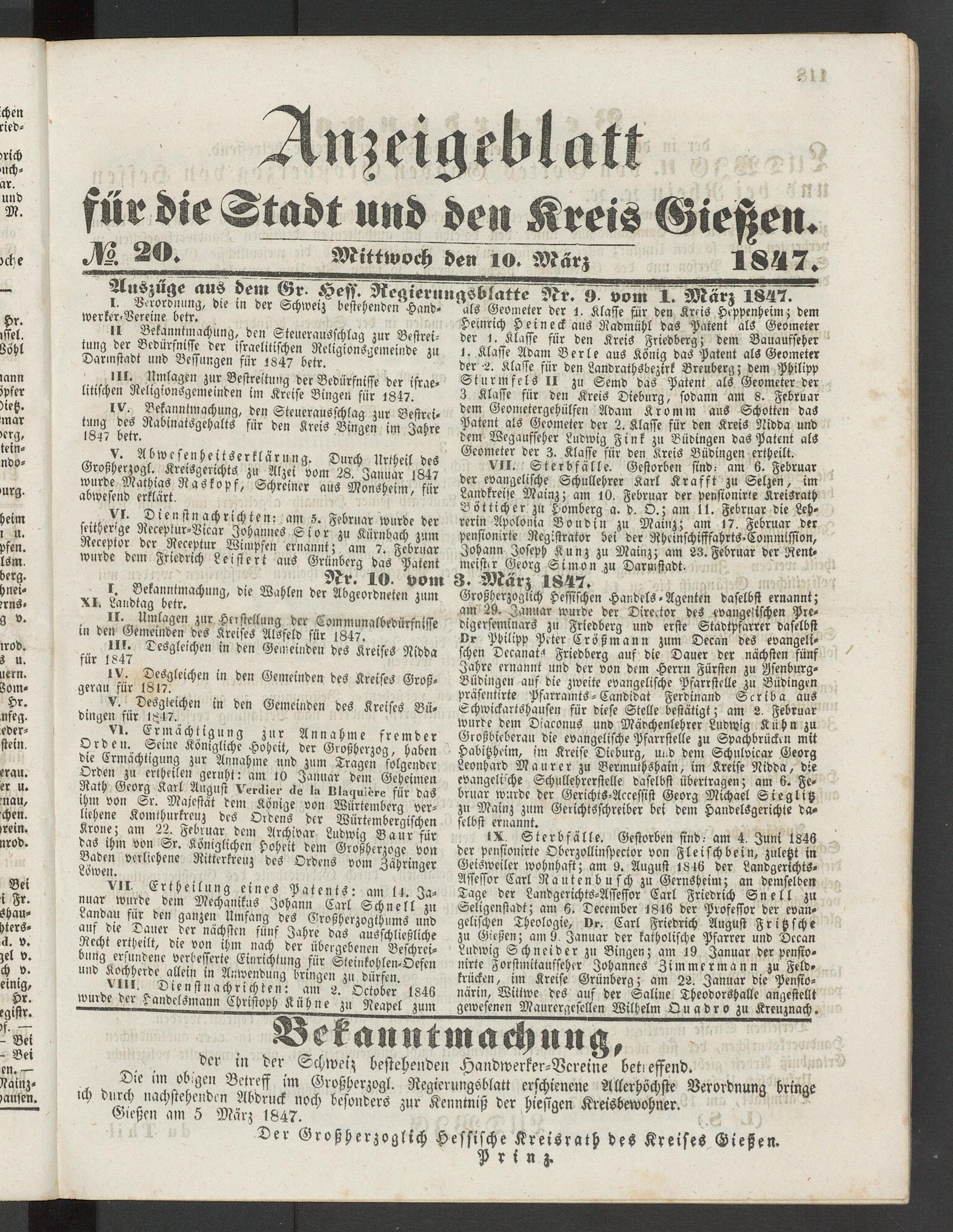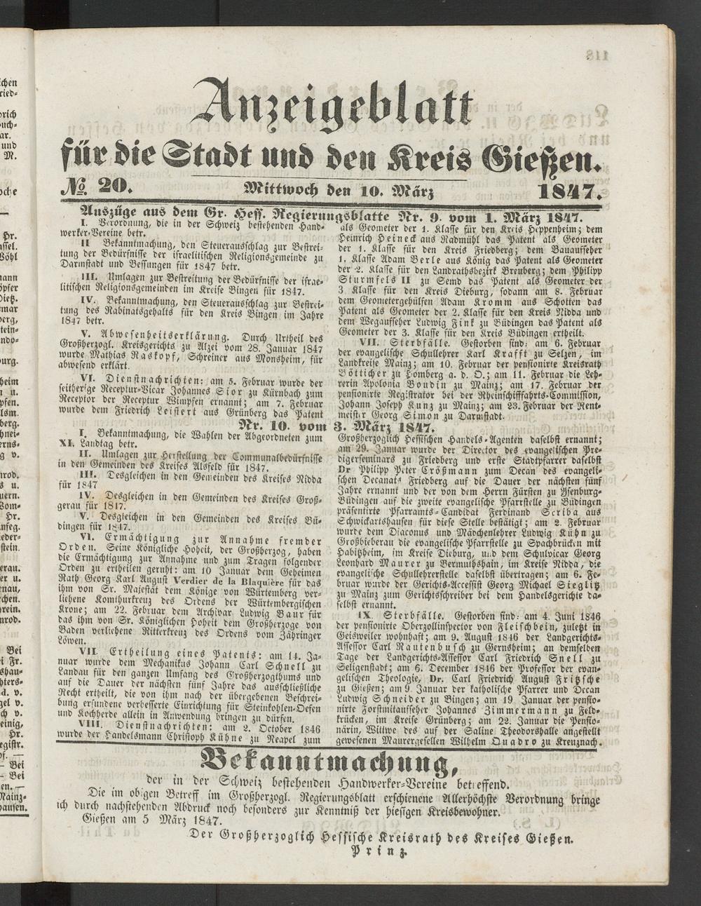 am 29. Januar wurde der Dire-tor des evangelischen Pre- digcrseminars zu Friedberg und erste Stadtpfarrer daselbst vr Philipp Peter Crüßmann zum Decan des evangelischen Decanat« Friedberg auf die Dauer der nächsten fünf Jahre ernannt und der von dem Herrn Fürsten zu Asenburg- Budingen auf die zweite evangelische Pfarrstelle zu Büdingen präsentirte Pfarramts-Candidat Ferdinand Seriba aus Schwickartshausen für diese Stelle bestätigt; am 2. Februar wurde dem Diaconus und Mädchenlehrer Ludwig Kühn zu Großbieberau die evangelische Pfarrstelle zu Spachbrücken mit Habitzheim, im Kreise Dieburg, und dem Schulvicar Georg Leonhard Maurer zu Bermuthshain, im Kreise Nidda, die evangcli'che Schullehrerstelle daselbst überiragen; am 6. Februar wurde der GerichtS-Accesfist Georg Michael Sieglitz zn Mainz zum Gerichtsschreiber bei dem Handelsgerichte daselbst ernannt.