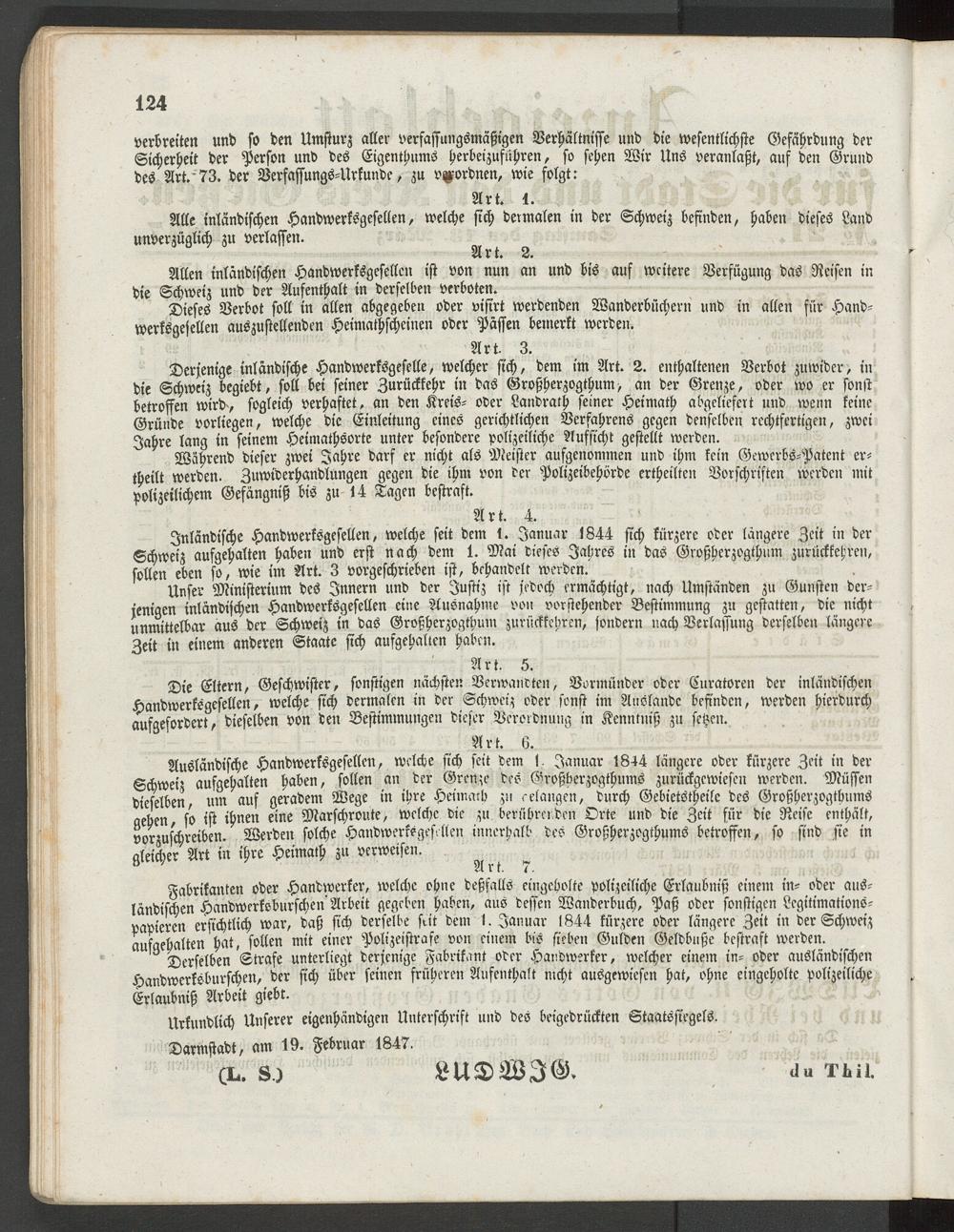 Inländische Handwerksgesellen, welche seit dem 1. Januar 1844 sich kürzere oder längere Zeit in der Schweiz aufgehalten haben und erst nach dem 1. Mai dieses Jahres in das Großherzogthum zurückkehren, sollen eben so, wie im Art. 3 vorgeschrieben ist, behandelt werden.