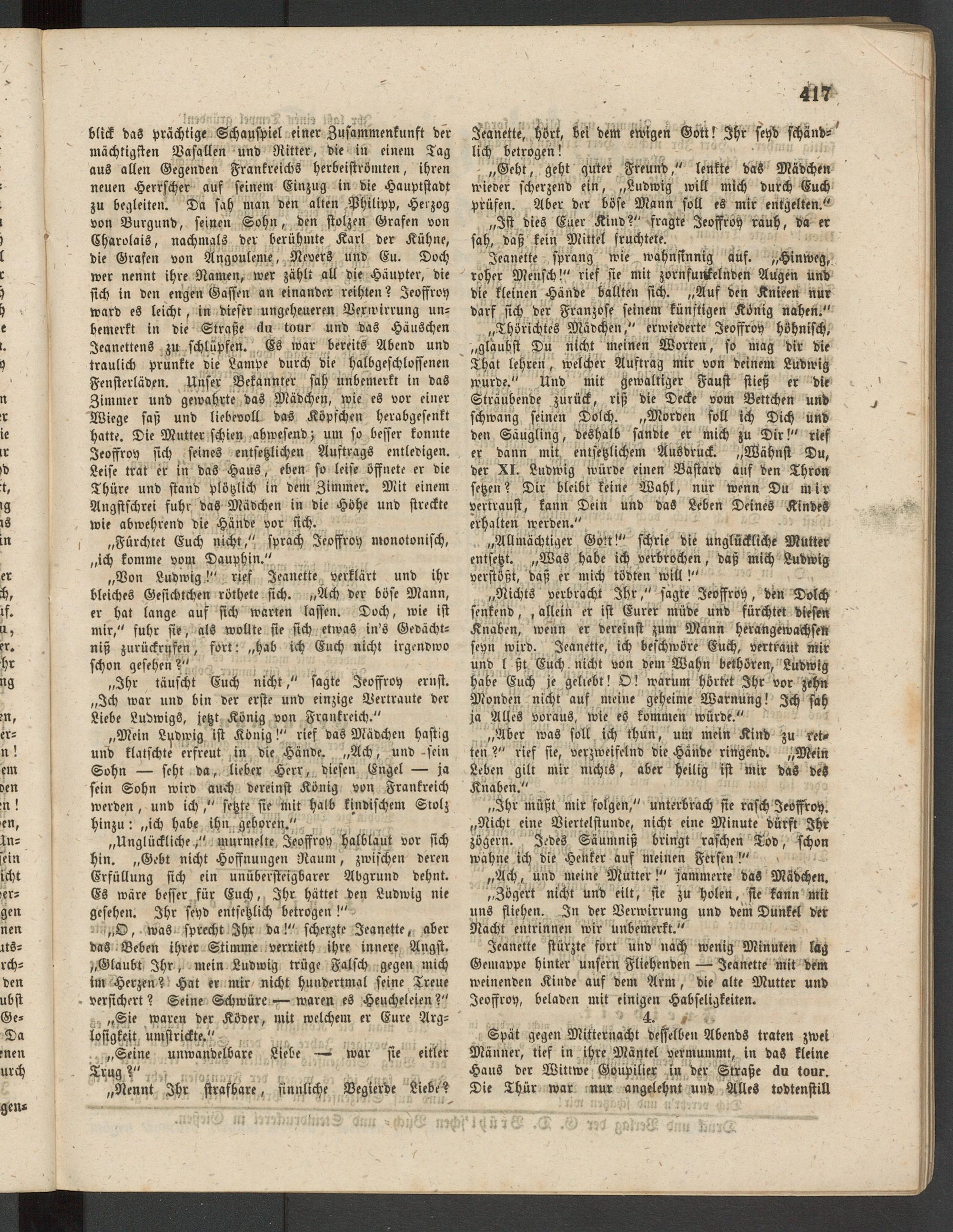 blick das prächtige Schauspiel einer Zusammenkunft der mächtigsten Vasallen und Ritter, die in einem Tag aus allen Gegenden Frankreichs herbciströmten, ihren neuen Herrscher auf seinem Einzug in die Hauptstadt zu begleiten. Da sah man den alten Philipp, Herzog von Burgund, seinen Sohn, den stolzen Grafen von Charolais, nachmals der berühmte Karl der Kühne, die Grafen von Angouleme, Nevers und Eu. Doch wer nennt ihre Namen, wer zählt all die Häupter, die sich in den engen Gassen an einander reihten? Jeoffroy ward es leicht, in dieser ungeheueren Verwirrung unbemerkt in die Straße du tour und das Häuschen Jeanettens zu schlüpfen. Es war bereits Abend und traulich prunkte die Lampe durch die halbgeschloffenen Fensterläden. Unser Bekannter sah unbemerkt in das Zimmer und gewahrte das Mädchen, wie es vor einer Wiege saß und liebevoll das Köpfchen herabgesenkt hatte. Die Mutter schien abwesend; um so besser konnte Jeoffroy sich seines entsetzlichen Auftrags entledigen. Leise trat er in das Haus, eben so leise öffnete er die Thüre und stand plötzlich in dem Zimmer. Mit einem Angstschrei fuhr das Mädchen in die Höhe und streckte wie abwehrend die Hände vor stch.