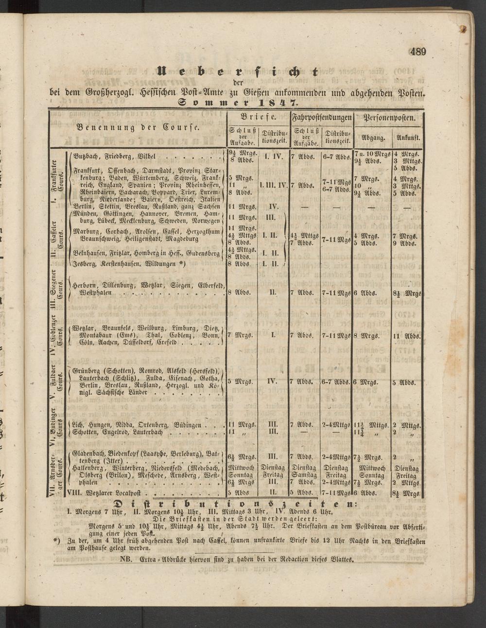 bei bent Großherzogl. Hessischen Post-Amte zu Gießen ankommenden nnd abgehenden Posten.