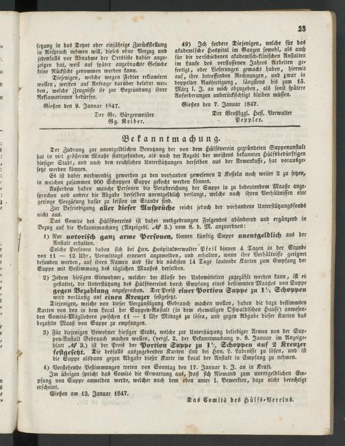 Solche Personen haben sich bei Hrn. Hospitalverwalter Pseil binnen 4 Tagen in der Stunde von 11 — 12 Uhr, Vormittags erneuert anzumelden, und erhalten, wenn ihre Verhältnisse geeignet befunden werden, auf ihren Namen und für die nächsten 14 Tage lautende Karten zum Empfang der Suppe mit Bestimmung des täglichen Maaßes derselben.