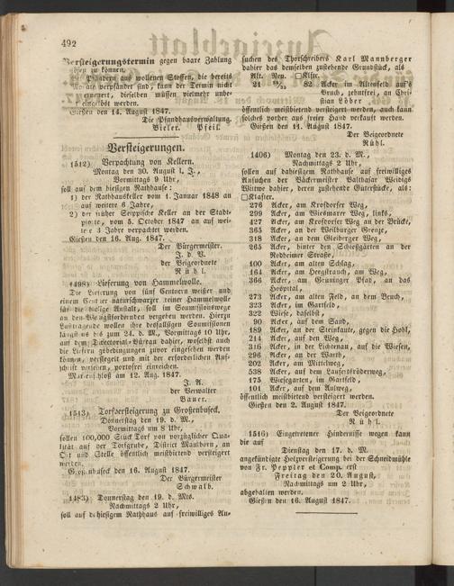 1406) Montag den 23. d. M., Nachmittags 2 Uhr, sollen auf dahiesigem Rathhause auf freiwilliges Ansuchen der Bäckermeister Balthasar Weidigs Wittwe dahier, deren zustehende Gütcrstücke, als: □klafter.