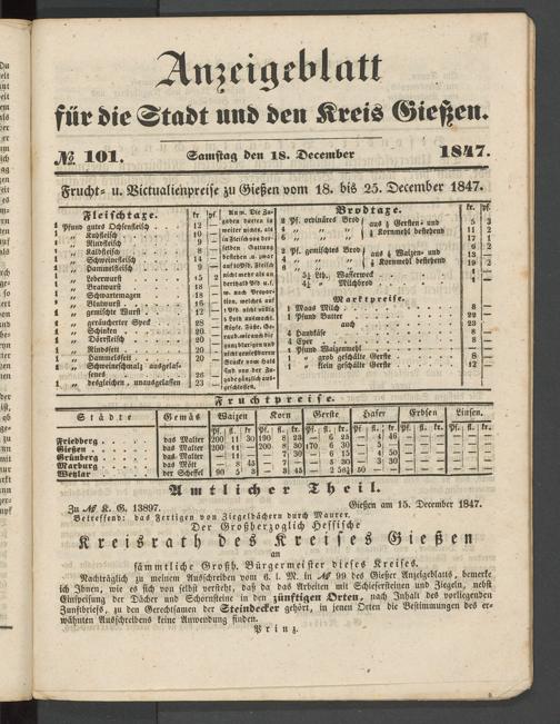 Frucht- u. Victualienpreise zu Gießen vom 18. bis 25. December 1847.
