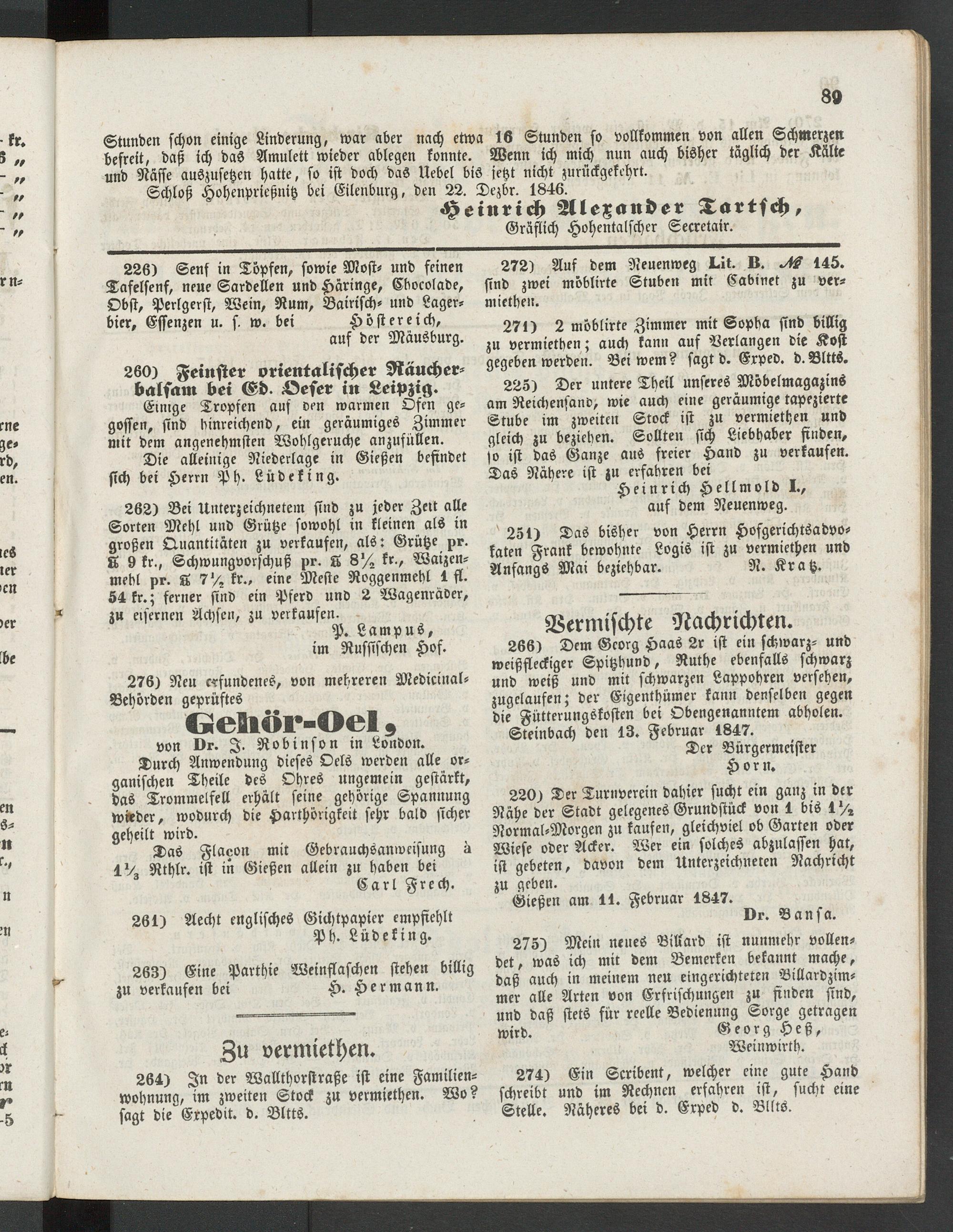 Schloß Hohenprießnitz bei Eilenburg, den 22. Dezbr. 1846.