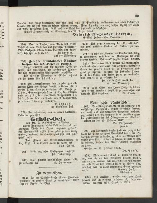 271) 2 möblirte Zimmer mit Sopha sind billig zu vermiethen; auch kann auf Verlangen die Kost gegeben werden. Bei wem? sagt d. Erpev. d. Bltts.