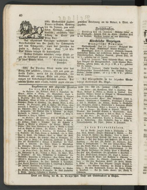 Angekommene und abgereiste Fremden vom 19. bis 21. Januar 1847.