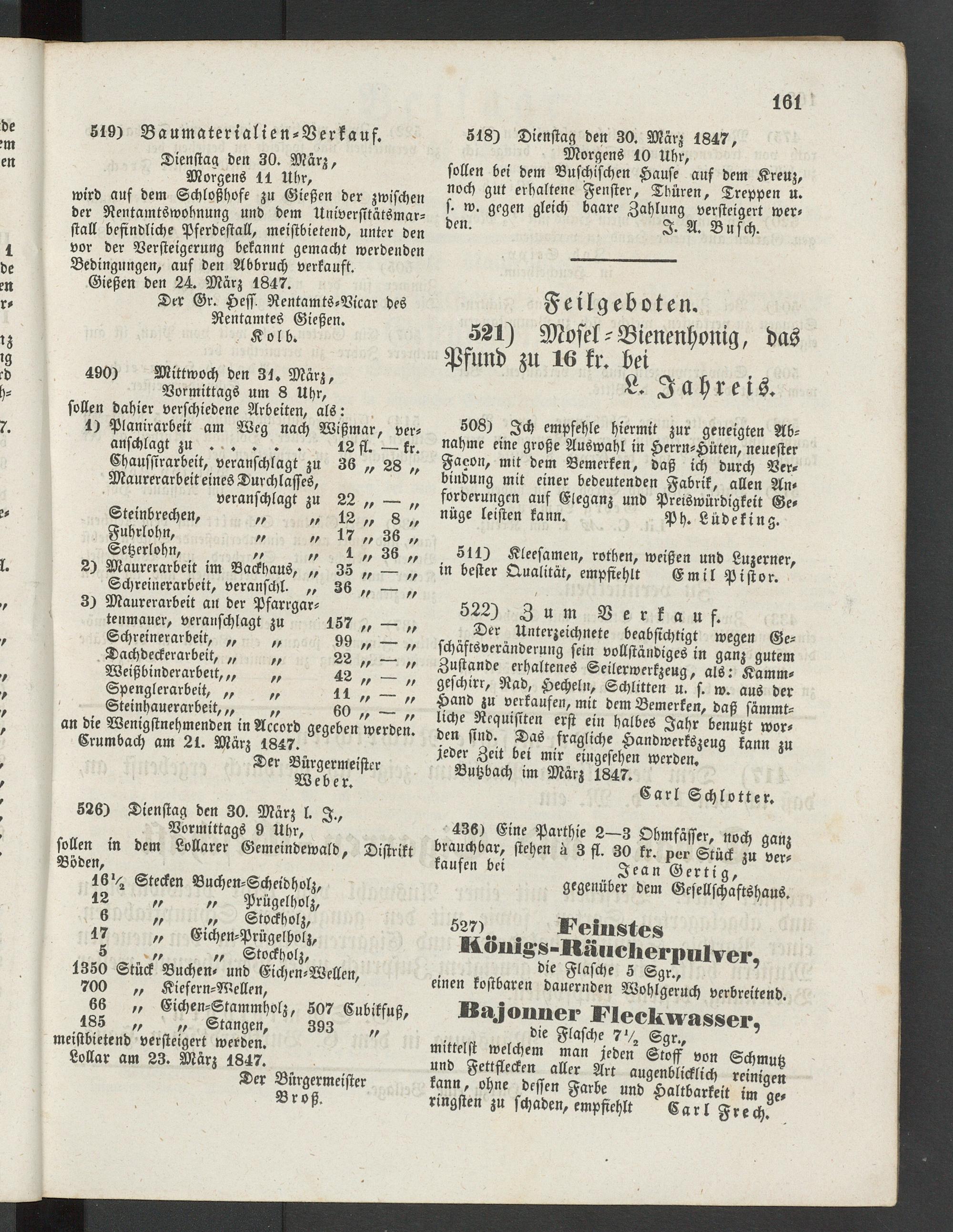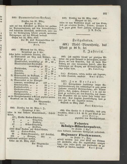 518) Dienstag den 30. März 1847, Morgens 10 Uhr, sollen bei dem Buschischen Hause auf dem Kreuz, noch gut erhaltene Fenster, Tbüren, Treppen u. s- w. gegen gleich baare Zahlung versteigert werde«. I. A. Busch.