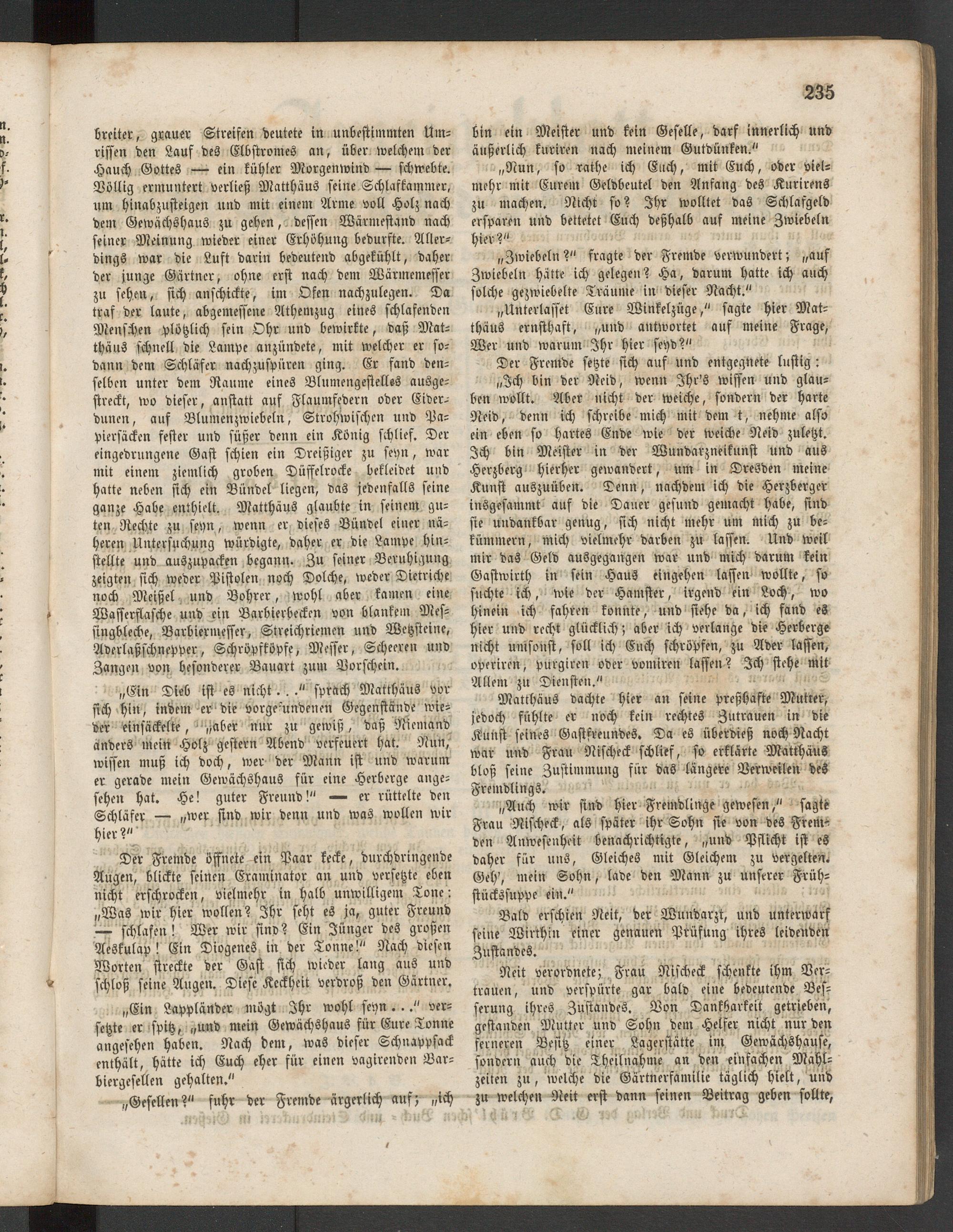 Breiter, grauer Streifen deutete in unbestimmten Umrissen den Lauf des Elbstromes an, über welchem der Hauch Gottes — ein kühler Morgenwind — schwebte. Völlig ermuntert verließ Matthäus seine Schlafkammer, um hinabzusteigen und mit einem Arme voll Holz nach dem Gewächshaus zu gehen, dessen Wärmestand nach seiner Meinung wieder einer Erhöhung bedurfte. Allerdings war die Luft darin bedeutend abgekühlt, daher der junge Gärtner, ohne erst nach dem Wärmemesser zu sehen, sich anschickte, im Ofen nachzulegen. Da traf der laute, abgemessene Athemzug eines schlafenden Menschen plötzlich sein Ohr und bewirkte, daß Matthäus schnell die Lampe anzündete, mit welcher er sodann dem Schläfer nachzuspüren ging. Er fand denselben unter dem Raume eines Blumengestelles ausgestreckt, wo dieser, anstatt auf Flaumfedern oder Eiderdunen, auf Blumenzwiebeln, Strohwischen und Papiersäcken fester und süßer denn ein König schlief. Der eingedrungene Gast schien ein Dreißiger zu seyn, war mit einem ziemlich groben Düffelrocke bekleidet und hatte neben sich ein Bündel liegen, das jedenfalls seine ganze Habe enthielt. Matthäus glaubte in seinem guten Rechte zu sepn, wenn er dieses Bündel einer näheren Untersuchung würdigte, daher er die Lampe hin- stellte und auszupacken begann- Zu seiner Beruhigung zeigten sich weder Pistolen noch Dolche, weder Dietriche noch Meißel und Bohrer, wohl aber kamen eine Wasserflasche und ein Barbierbecken von blankem Messingbleche, Varbiermeffer, Streichriemen und Wetzsteine, Aderlaßschnepper, Schröpfköpfe, Messer, Scheelen und Zangen von besonderer Bauart zum Vorschein.
