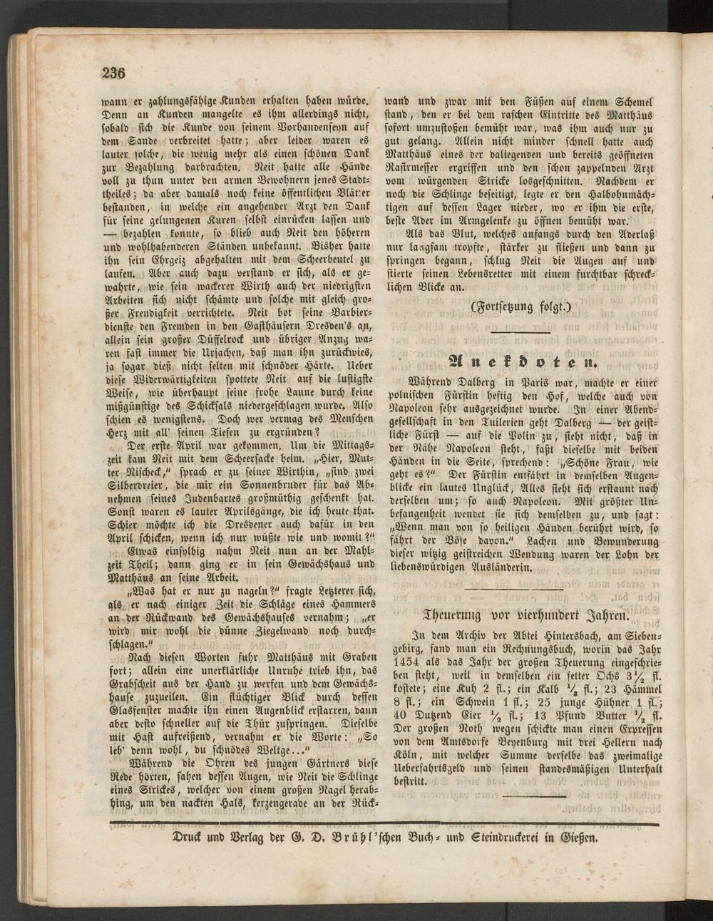 In dem Archiv der Abtei Hintersbach, am Sieben- gebirg, fand man ein Rechnungsbuch, worin das Jahr 1454 als das Jahr der großen Theuerung eingeschrieben steht, weil in demselben ein fetter Ochs 3% ft. kostete; eine Kuh 2 ft.; ein Kalb V3 ft.; 23 Hämmel 8 ft.; ein Schwein 1 ft.; 25 junge Hühner 1 ft.; 40 Dutzend Eier % ft.; 13 Pfund Butter % ft. Der großen Noch wegen schickte man einen Erpressen von dem Amtsdorfe Beyenburg mit drei Hellern nach Köln, mit welcher Summe derselbe das zweimalige Ueberfahrtsgeld und seinen standesmäßigen Unterhalt bestritt.