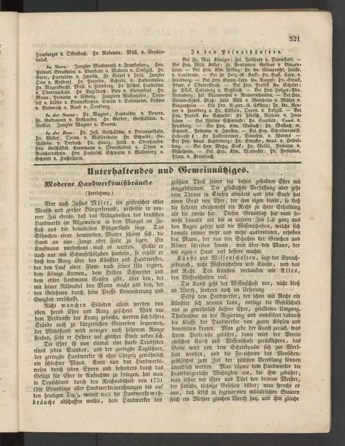 Die Ehre ist nun einmal eine starke Triebfeder eines jeden Standes, und der geringste Taglöhncr, der geringste Handwerker ist ohne Ehrgeiz gewöhnlich ein schlechter Mann. Statt nun das Handwcrks- wesen durch jeden Sporn und besonders durch das Gefühl für Ehre in Aufnahme zu bringen, hat man in Deutschland durch den Reichsabschied von 1731 (die Grundlage aller Handwerkscinrichtungen bis auf den heutigen Tag), womit'inan die Handwerks m i ß- hrauche abschaffen wollte, dem Handwerker den