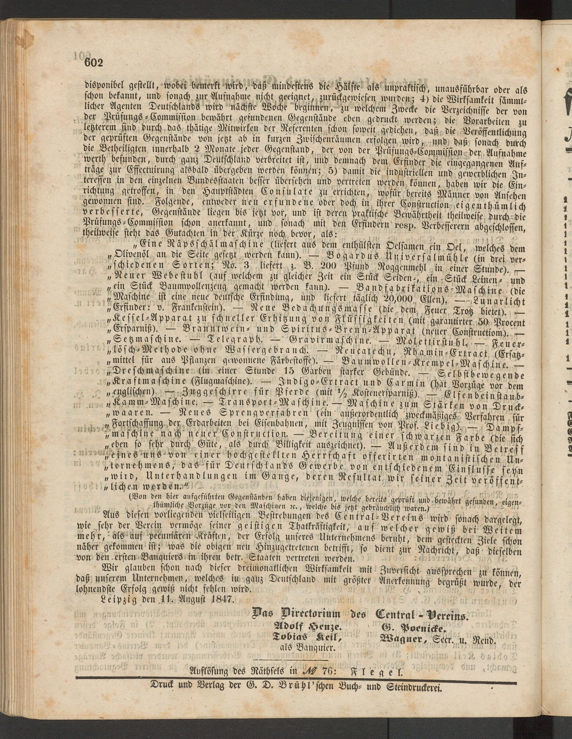 „Kessel-Apparat zu schneller Erhitzung von Flüssigkeiten (mit garantirter 50 Proeent „Ersparniß). — Branntwein- nnd Spiritus-Brenn-Apparat (neuer Construetiom) — „Setzmaschine. — Telegraph. — Gr a vi r m asch i ne. — Molettirstu hl. — Fouer- „lösch-Methode ohne Wassergebrauch. — Neneatechu, Rh a min-Eri'ract (Ersak- „mittel für aus Pflanzen gewonnene Färbestoffs). — Baumwolleu-Krempel-Maschine — „Dreschmaschine (in einer Stunde 15 Garben starker Münde. — Selbstbeweqende „Kraftmaschine (Flugmaschine). — Indigo--Ertraet und Carmiu (liat Vorzüge vor dem „englischen). — Zuggeschirre für Pferde (mit % Kostenerfparniß). — Elfenbeinstand- „Kamm-Maschine. - Transport-Maschine. - Maschine zum Stärken von Druck- „waaren. — Neues Sprengverfahren (ein außerordentlich zweckmäßiges Verfahren für „ Fortschaffung der Erdarbeiten bei Eisenbahnen, mit Zeugnissen von Prof. Liebig) — Damvf- „maschine nach neuer Constru ction. — Bereitung einer schwarzen Farbe rbie firfs „eben so sehr durch Güte, als durch Billigkeit auszeichnet). — Außerdem sind in Betreff „ eines uns- von einer hochgestellten Herrschaft offerirten montanistischen Un- „ternehmens, daö für Deutschlands Gewerbe von entschiedenem Einflüsse sevn „wird, Unterhandlungen im Gange, deren Resultat wir seiner Zeit veröffent- ,, liche.n werden."