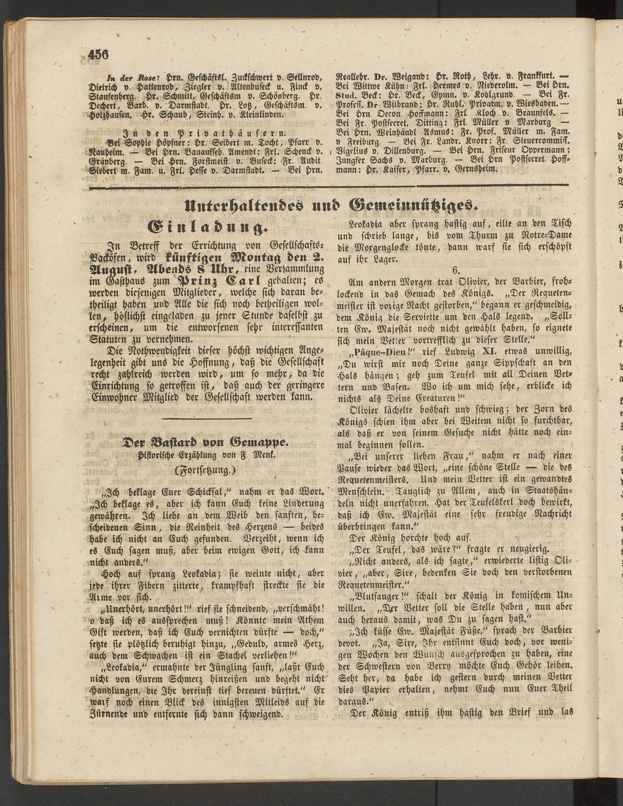 Bei Sophie Höpfner: Hr. Seibert m. Tocht, Pfarr v. Nauheim. — Bei Hrn. Bauaufseh. Amendt: Frl. Schenck v. Grünberg. — Bei Hrn. Forstmeist v. Buscck: Fr. Audit. Siebert m. Fam. u. Frl. Hesse v. Darmstadt. — Bei Hrn.