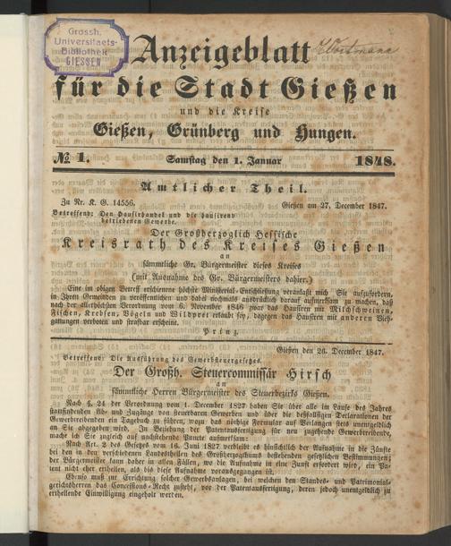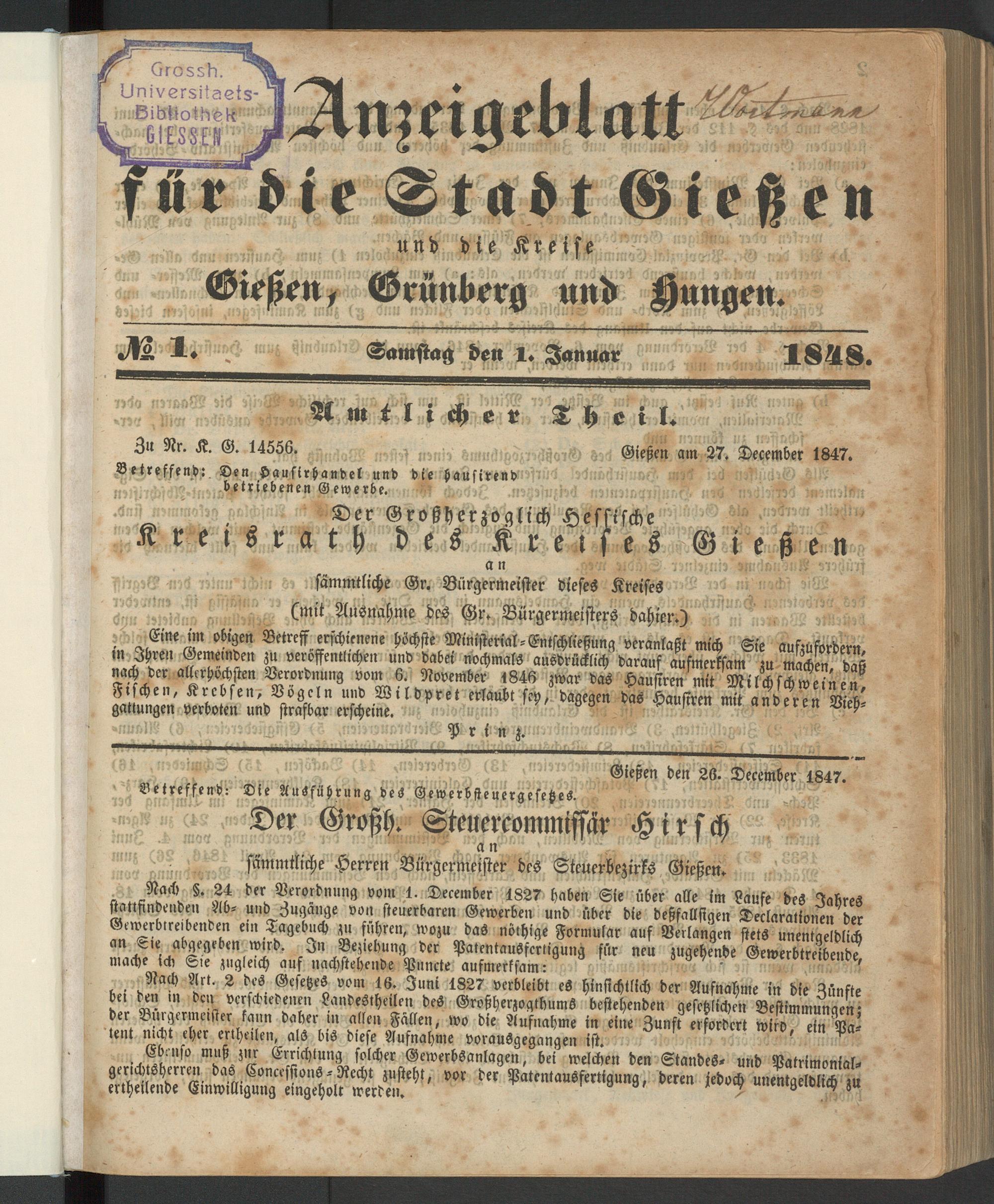 Gießen den 26. December 1847. Betreffend: Die Ausführung des Gewerbsteuergesetzes.